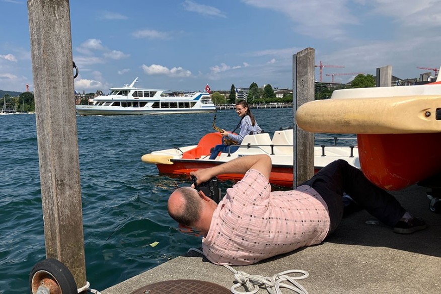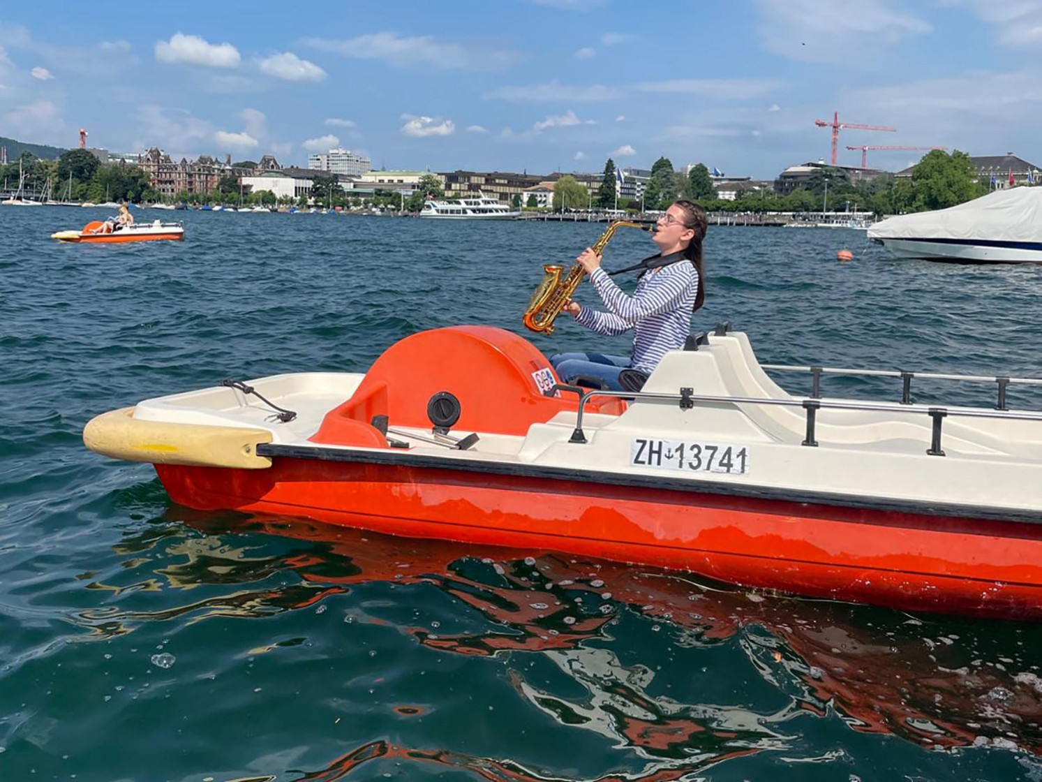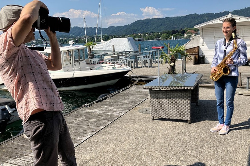 Für eines der Fotoshootings stellte sich die 15-jährige Elin Suremann zur Verfügung. Sie ist seit 5 Jahren Schülerin an MKZ und spielt Saxofon. Die Fotos von ihr sollen auf einem Pedalo aufgenommen werden. Ein ungewöhnlicher und herausfordernder Ort, der jedoch eine besondere Atmosphäre verspricht. Die Standorte sollen jeweils die Stadt Zürich repräsentieren, um die Zugehörigkeit von MKZ als Bestandteil der Stadt zu unterstreichen.