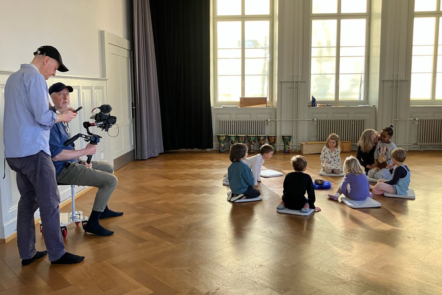 Ein Vormittag im Februar, in der Stadt Zürich. In einem hellen Raum voller bunter Tücher, Trommeln, Klanghölzer und Kinderlachen herrscht geschäftiges Treiben. Die Kamera ist bereit, das Mikrofon ausgerichtet, das Licht sitzt – und der «ElKi»-Unterricht von Merlin Mattheeuws, Lehrer an MKZ, kann beginnen. Es ist eine besondere Stunde, denn die Beteiligten – Lehrperson, Eltern und Kinder – wissen, dass sie heute gefilmt werden (und haben vorgängig ihr Einverständnis dazu gegeben). Nach wenigen Minuten sind die Kameraleute, die Brüder Marc und Marcel Schwarz von «schwarzpictures», vergessen. Die Kleinkinder und ihre Bezugspersonen lassen sich ganz auf die Lieder, Tänze und Geschichten ein, die Merlin Mattheeuws für sie vorbereitet hat. Die Stunde läuft wie am Schnürchen. Ein Interview mit der Lehrperson rundet diesen ersten Dreh-Vormittag ab. Das Team vor Ort ist mehr als zufrieden: Alles ist wie geplant gelaufen, die Beteiligten haben sich wohlgefühlt, und es ist schon viel gutes Material im Kasten. «Es ist unglaublich, wie schnell Kinder auf Musik reagieren – mit dem ganzen Körper, mit der Stimme, mit leuchtenden Augen», sagt Marc Schwarz. «Genau das wollen wir sichtbar machen.»