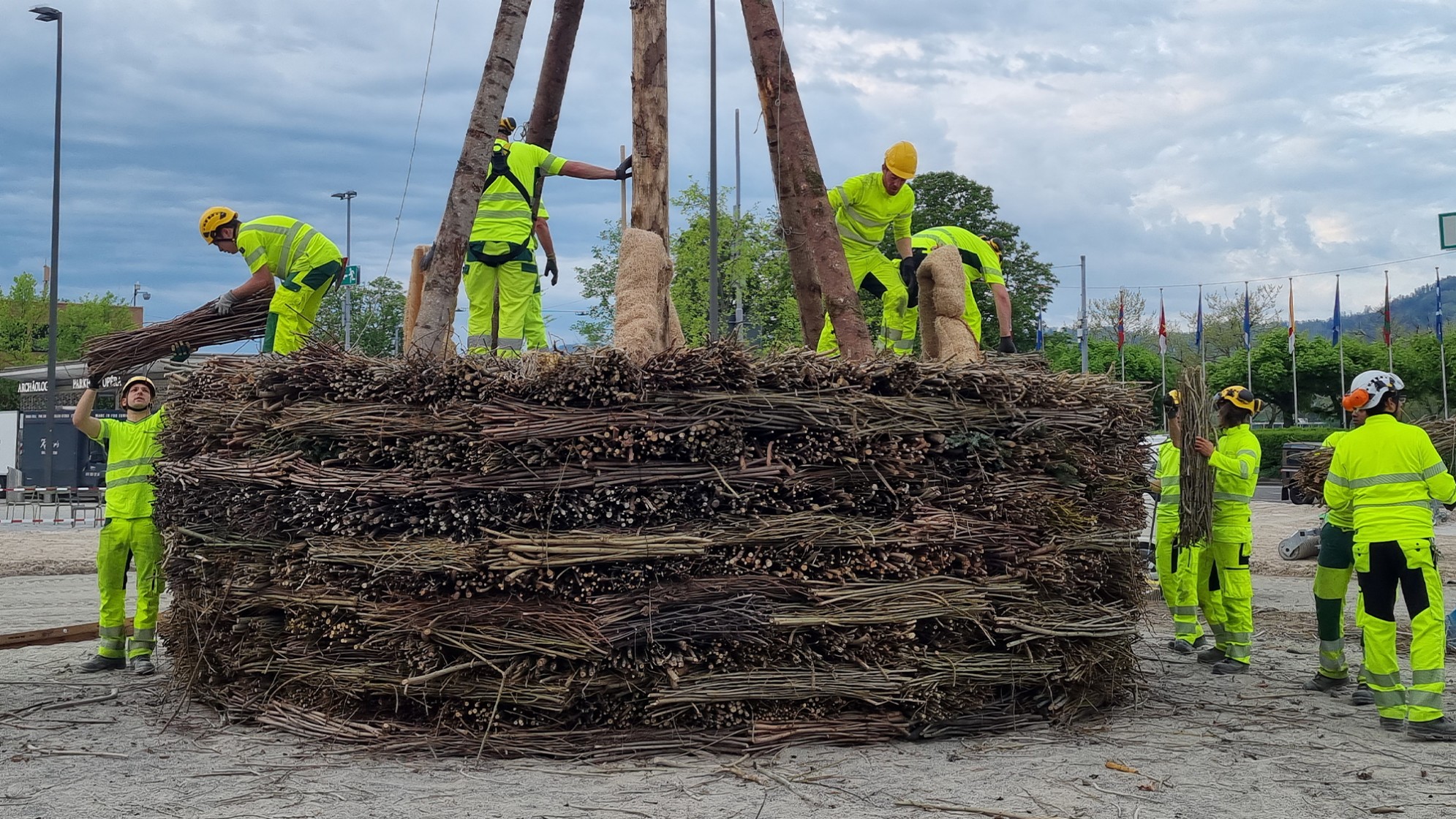 Drei LKW liefern nacheinander rund 7000 «Bürdeli» an. Mit ihnen wird der Holzstoss Meter für Meter aufgeschichtet – und das während sechs Stunden mit Präzision: Mit einer Holzlatte, die immer wieder gekürzt wird, und Richtschnüren wird geprüft, dass der Aufbau ganz gleichmässig vonstattengeht. Unterhalb des Bööggs kommen ganz trockene Bürdeli vom vergangenen Jahr, um dem Watte-Schneemann zum Schluss so richtig einzuheizen.