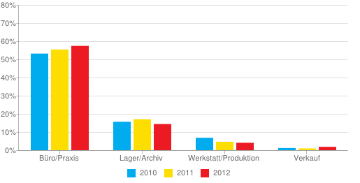 Im Jahr 2012 sind 72 Prozent der nicht vermieteten Flächen zur Nutzung als Büro- oder Praxisgewerbe vorgesehen. Dies entspricht einer Fläche von 125 000 Quadratmetern. Die Büroflächen zeigen seit Jahren den grössten Anteil an den leer stehenden Nutzflächen. Der Anteil von Lager und Archiv an leeren Nutzungsflächen beträgt 18 Prozent, derjenige von Werkstatt und Produktion liegt bei 5 Prozent.