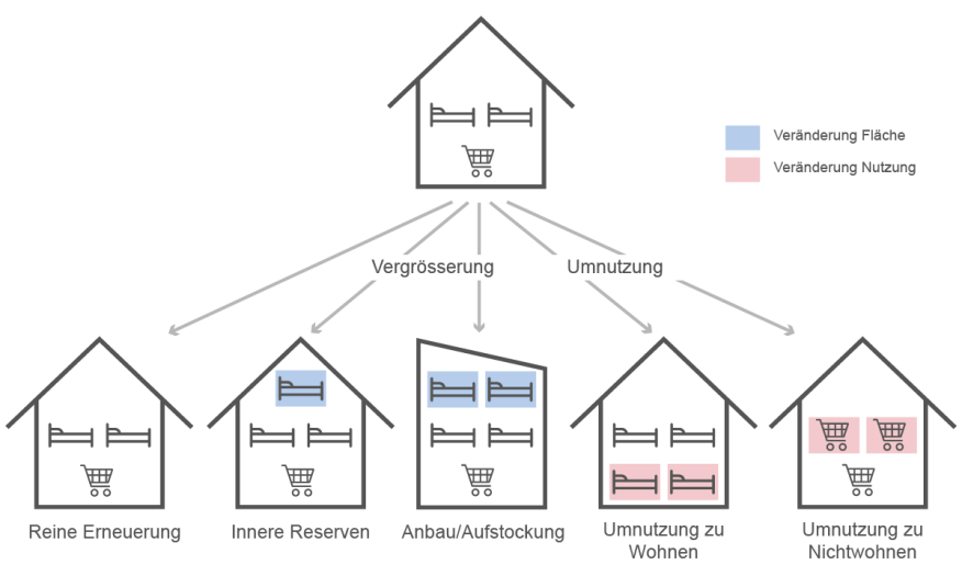 - Umnutzung zu Nichtwohnen: Die Grundfläche und die Anzahl Stockwerke des Gebäudes bleiben unverändert. Wohnraum wird in kommerzielle oder andere Nutzflächen umgewandelt. Die Wohnungsfläche des Gebäudes nimmt ab.