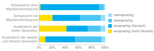 Ein Fünftel der Schweizerinnen und Schweizer mit Migrationshintergrund sprechen nur eine Hauptsprache, bei der es sich nicht um Deutsch handelt. Bei den Ausländerinnen und Ausländern der ersten Generation sind dies sogar doppelt so viele. Interessant ist der Unterschied zu den Ausländerinnen und Ausländern der zweiten oder höheren Generation: Eine Mehrheit von ihnen spricht deutsch, für etwa die Hälfte ist Deutsch sogar die einzige Hauptsprache.