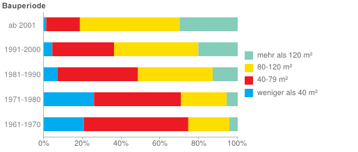 Bei Wohnungen mit Baujahr ab 2001 liegt der Anteil von Wohnungen mit 80 und mehr Quadratmetern bei 81 Prozent. Ein Jahrzehnt zuvor lag dieser Wert bei 64 Prozent. Bei den Wohnungen mit Bauperiode 1961 und 1970 verfügt nur gerade jede vierte Wohnung über einen Grundriss mit mehr als 80 Quadratmetern.