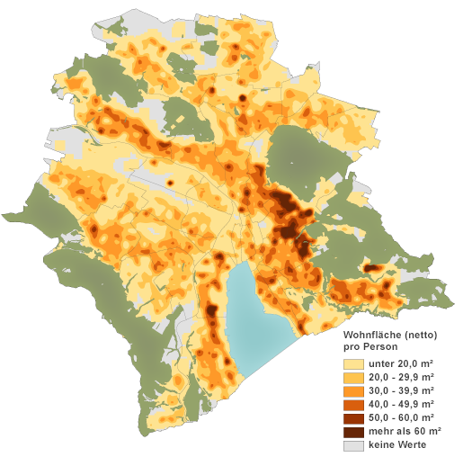 Im Kontrast dazu stehen die Quartiere des Zürichbergs, wo zahlreiche grössere Wohnungen mit einer tiefen Belegung angesiedelt sind. Dort wohnen Personen mit teils überdurchschnittlichen Einkommen, weshalb ein hoher Wohnflächenverbrauch pro Person anzutreffen ist. In diesen Gebieten im Nordosten der Stadt liegt der Wohnflächenkonsum pro Person teilweise bei über 60 Quadratmetern und somit deutlich über dem städtischen Durchschnitt von 41 Quadratmetern.