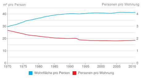 Lebten 1970 durchschnittlich 2,7 Personen in einer Wohnung, so waren es dreissig Jahre später rund 1,8. Seither wurden die Haushalte vermehrt wieder grösser. Daher ist seit einigen Jahren ein stagnierender Wohnflächenverbrauch pro Person festzustellen. Viele gemeinnützige Wohnbauträger verlangen eine Mindestbelegung. Sie berechnet sich bei genossenschaftlichen Wohnungen mehrheitlich – zumindest zu Beginn des Mietverhältnisses – aus der Zimmerzahl minus eins. So wird sichergestellt, dass die günstigen Mietzinse der Baugenossenschaften nicht zu einem Mehrverbrauch an Wohnfläche führen. Dies ist mit ein Grund, warum der Wohnflächenverbrauch bei den Baugenossenschaften unter dem städtischen Durchschnitt liegt.