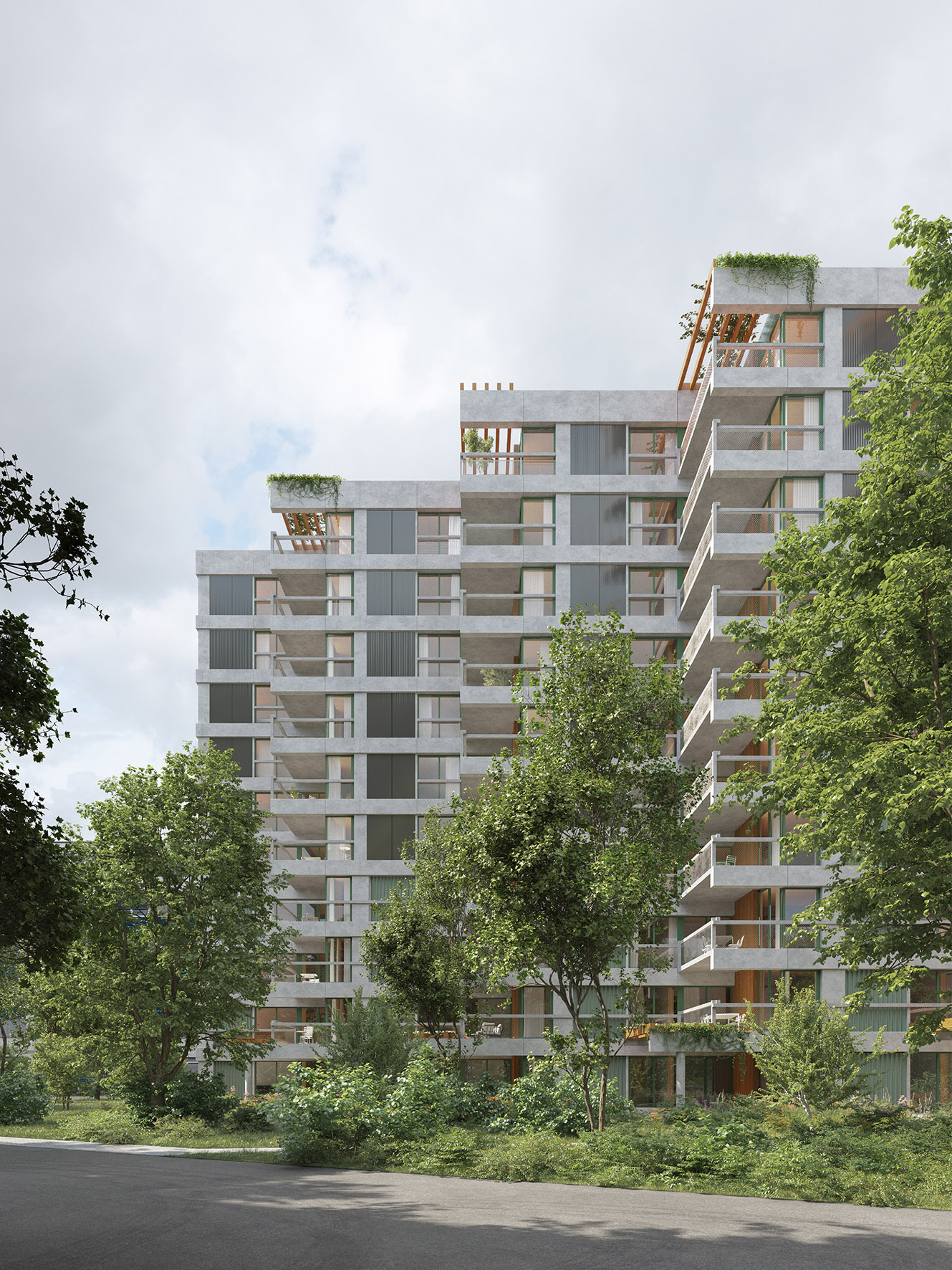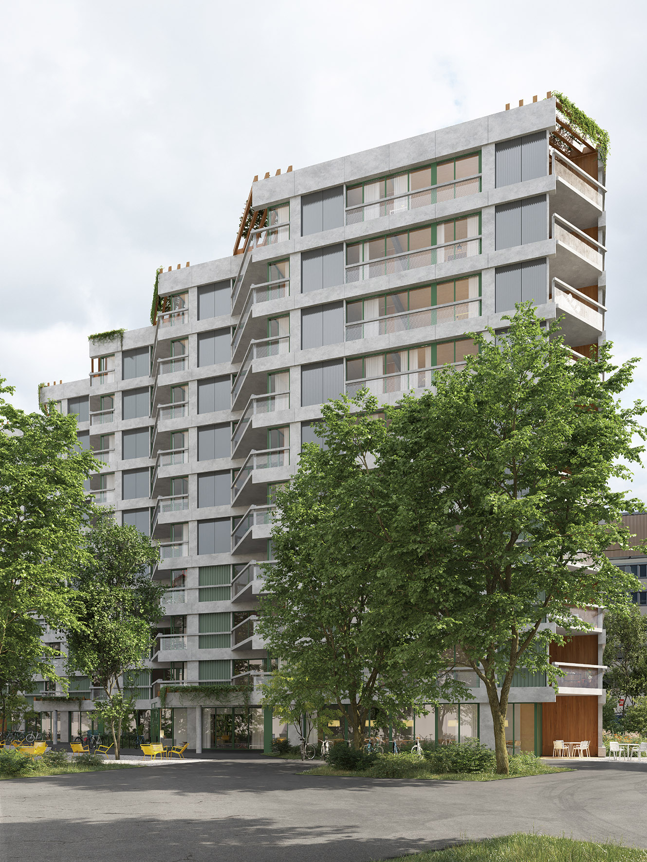 Eine ressourcensparende Konstruktion und Photovoltaik-Elemente auf Dächern und an Fassaden lassen bezüglich Treibhausgasemissionen eine gute Bilanz erwarten. Die Siedlung soll nach Minergie-A-ECO-Standard erstellt und über das Fernwärmenetz von ERZ beheizt werden. Die Umgebungsgestaltung mit vielen neuen Baumpflanzungen und unversiegelten Flächen integriert sich in den «Inneren Garten Leutschenbach» und leistet einen Beitrag zur lokalen Hitzeminderung. Nach Abschluss des Vorprojekts (voraussichtlich Anfang 2025) muss der Baurechtsvertrag vom Zürcher Gemeinderat genehmigt werden. Ein reibungsloser Planungs- und Bauprozess vorausgesetzt, könnten die ersten Mieter*innen 2028 einziehen.