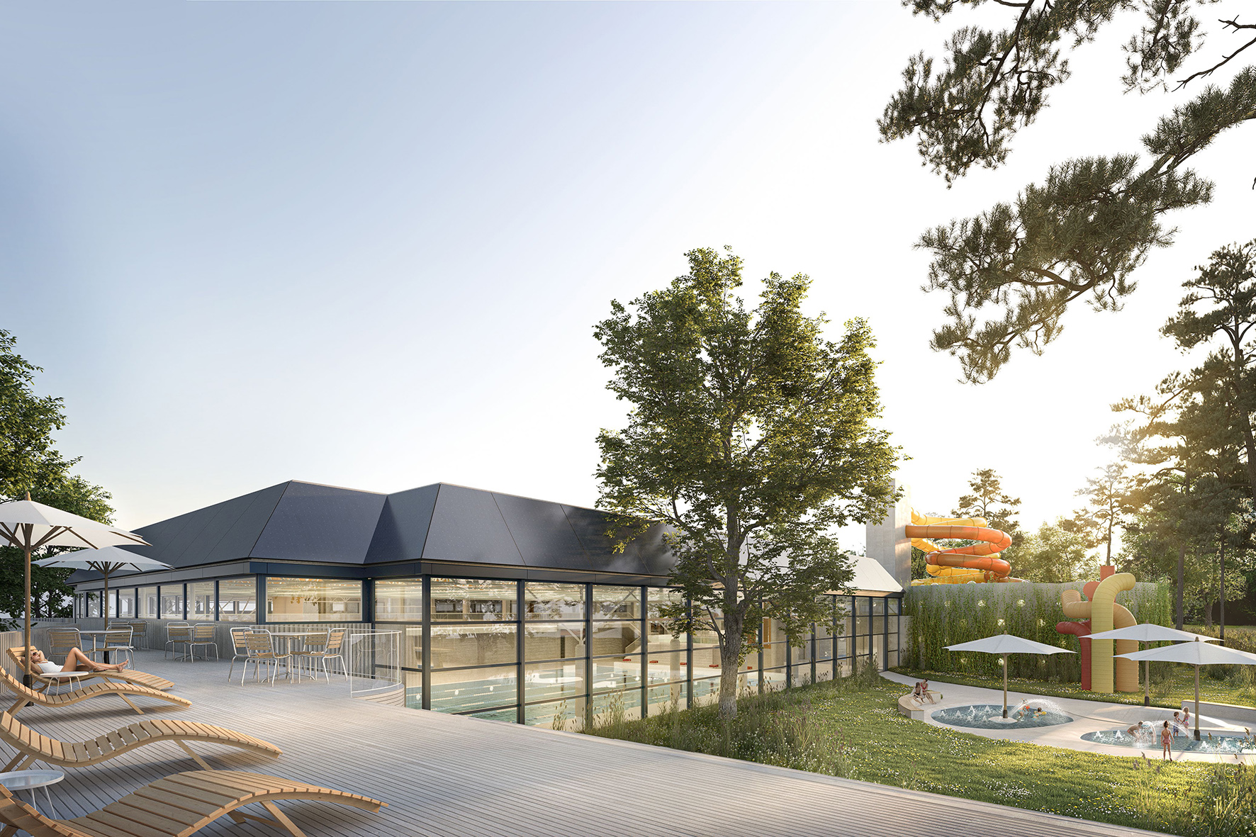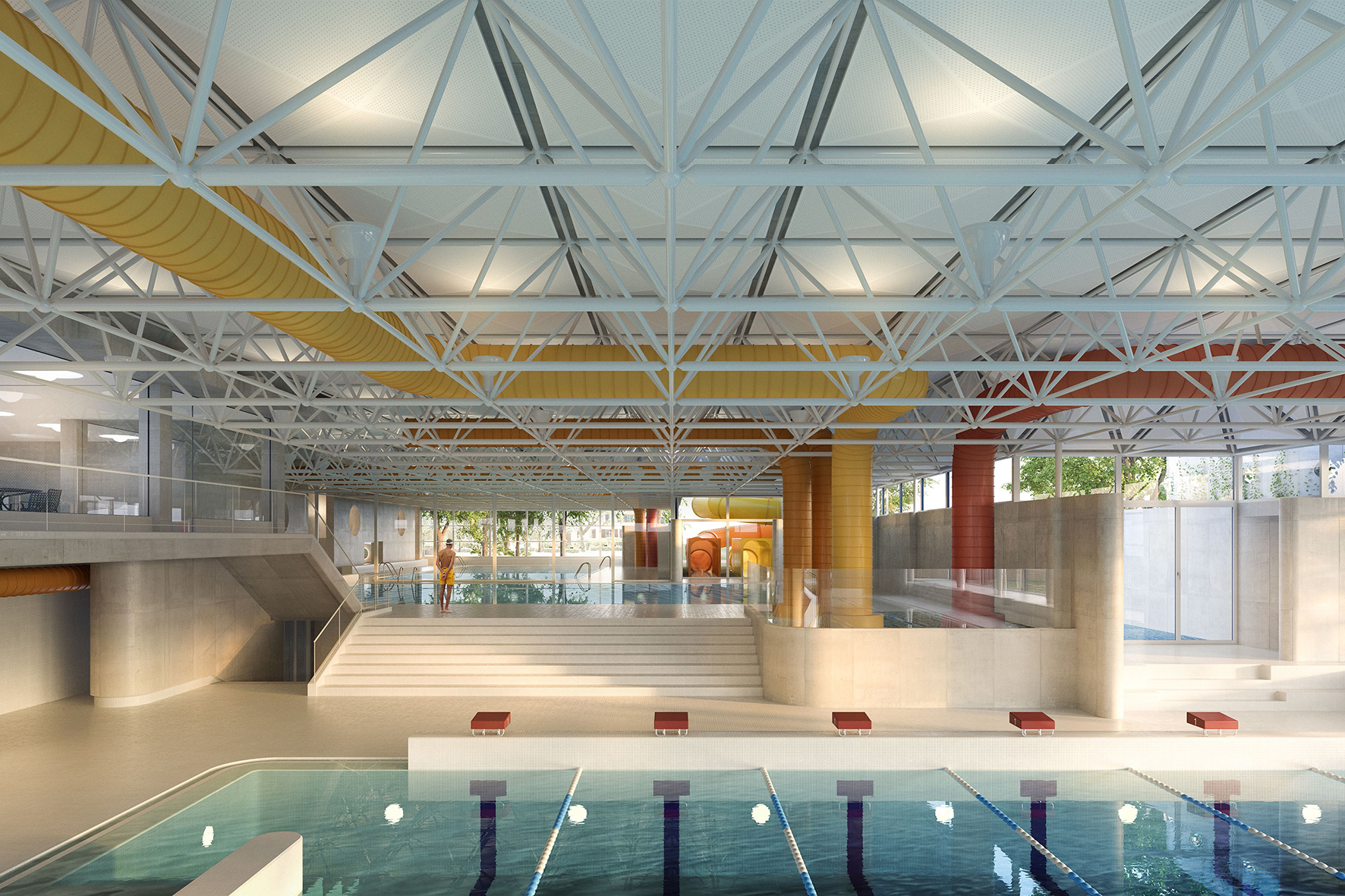 Berrel Kräutler Architekten AG aus Zürich und Bryum GmbH Landschaftsarchitektur aus Basel haben den anonym durchgeführten Wettbewerb für die Instandsetzung und Erweiterung des Hallenbads Altstetten gewonnen. Das Siegerprojekt «Nepomuk» erweitert den Bestandsbau aus den 1970er-Jahren mit einem Anbau entlang der Stampfenbrunnenstrasse. Ganz selbstverständlich aneinandergefügt erscheint alles aus einem Guss. Die unterschiedlichen Nutzungen – der Schwimm- und Wellnessbereich, die Sport- und Trainingshallen sowie die neue Saunalandschaft auf dem Dach – werden klar organisiert, das Foyer ist übersichtlich und grosszügig gestaltet. Der Anbau mit dem neuen Lernschwimmbecken verfügt über einen separaten Eingang und Garderobenanlagen für Schulen und Vereine. Die neue Terrasse im Westen ist vom Restaurant erreichbar und bietet einen Überblick über die Liegewiese.