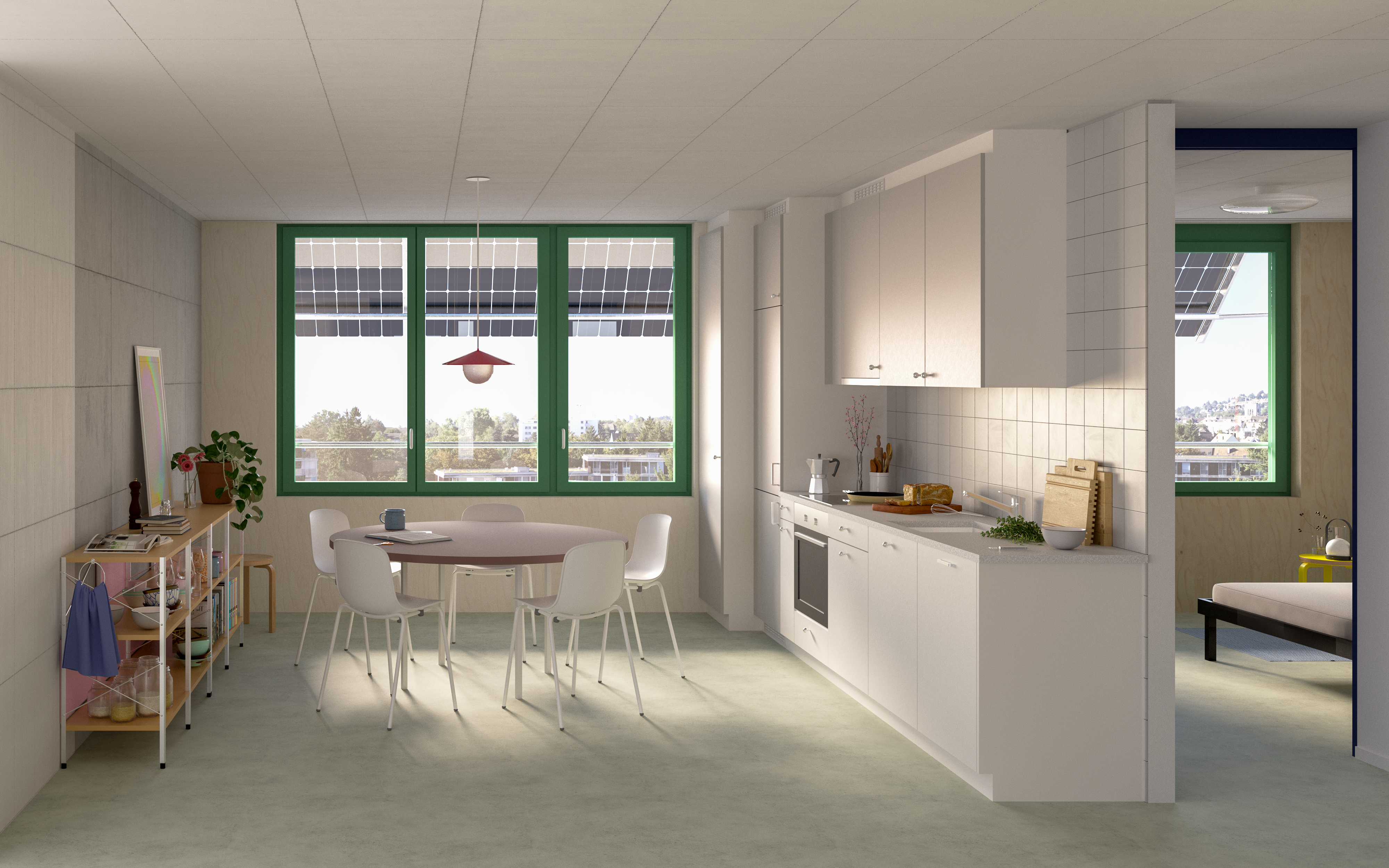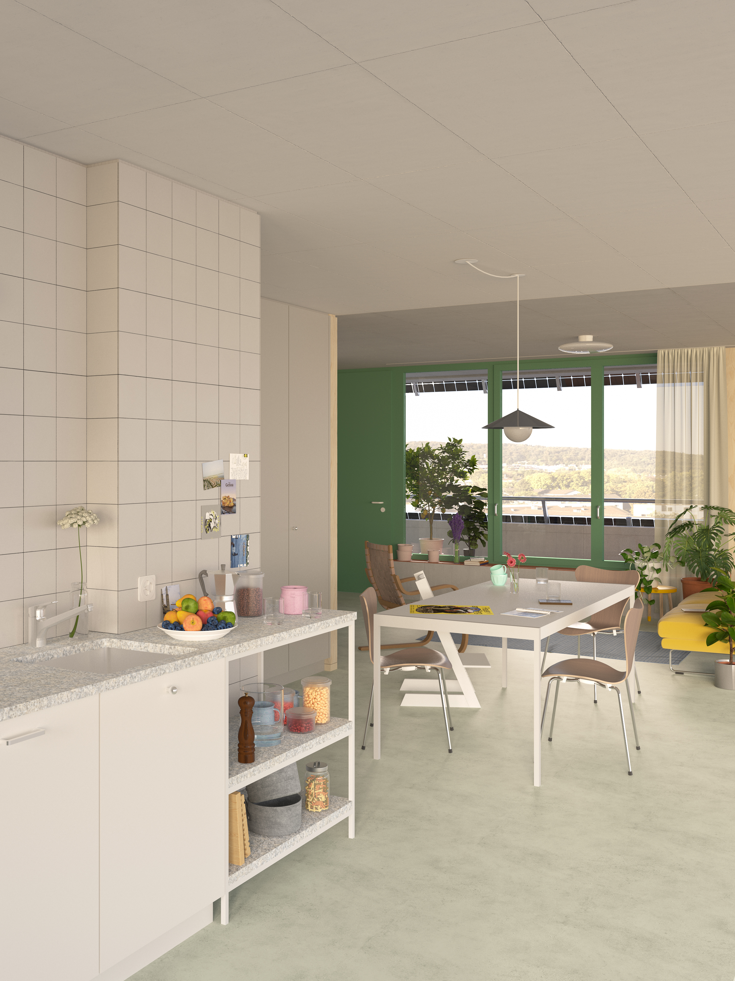 Die Wohngebäude und der eingeschossige Kindergarten bilden ein Ensemble. Die Wohnungen sind von hoher räumlicher Qualität und bieten Blickbeziehungen in alle Richtungen. Den Bewohnenden stehen ein Gemeinschaftsraum im Erdgeschoss, eine Gemeinschaftsküche im Dachgeschoss und ein Gästezimmer zur Verfügung. Der Gemeinschaftsraum wird auch an externe Personen vermietet. Die Bewohnenden können in einem Mitwirkungsprozess erarbeiten, wie die drei Ateliers gemeinsam genutzt werden. Auch im Aussenraum gibt es gemeinschaftlich nutzbare Flächen wie die Nachbarschaftsterrasse und den Quartierplatz.