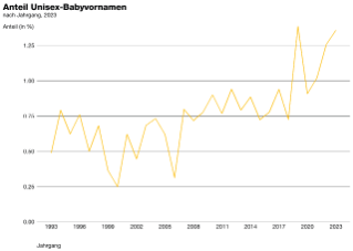 Vornamen, die sich sowohl für Mädchen als auch für Knaben eignen, erfreuen sich steigender Beliebtheit: Während vor 30 Jahren rund 0,5 Prozent aller Baby-Vornamen beiden amtlichen Geschlechtern zugewiesen wurden, lag dieser Anteil 2023 bei rund 1,4 Prozent. Beliebte Beispiele dafür sind Lou, Andrea, Noa, Robin oder Charlie.