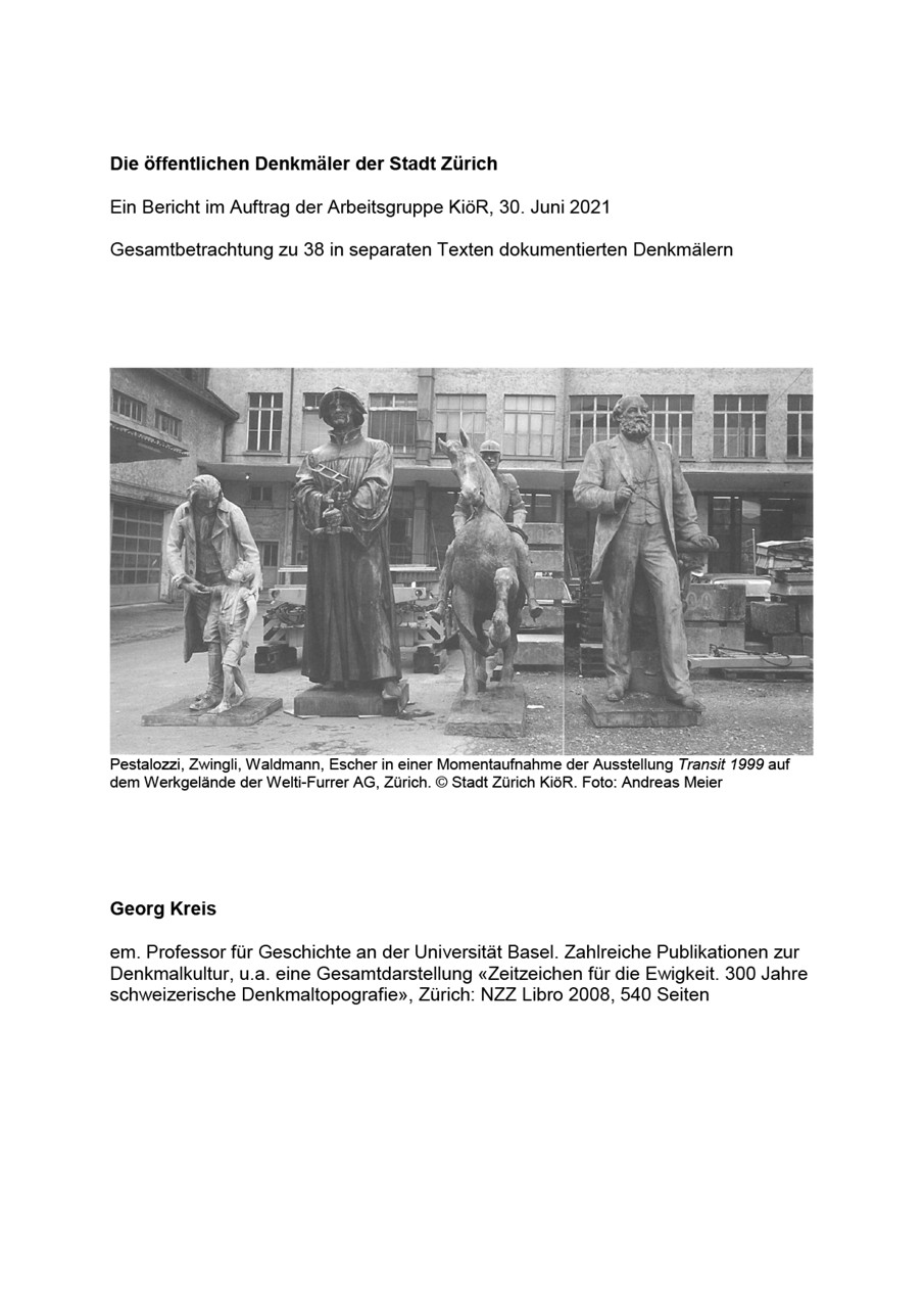 Mit dem Bericht von Georg Kreis zu den Denkmälern der Stadt Zürich wird versucht, dem aktuellen Forschungsstand (Zeitpunkt: Datum Bericht) Rechnung zu tragen. Zusätzliche Hinweise auf andere Forschungsarbeiten oder neue Erkenntnisse werden von der KiöR gerne entgegengenommen.