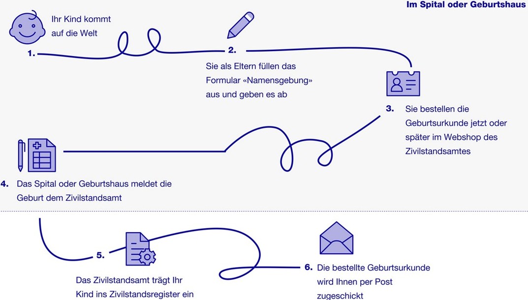- Das Spital oder das Geburtshaus meldet jede Geburt automatisch dem Zivilstandsamt.
