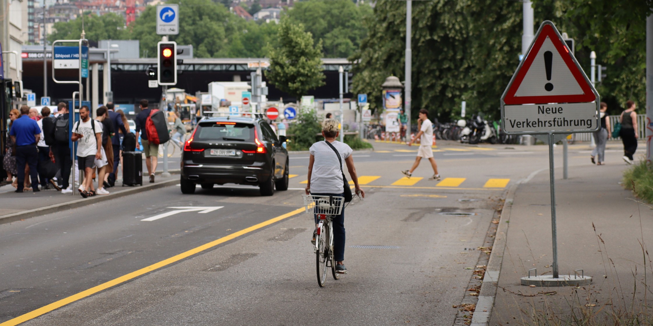 In der Kasernenstrasse, zwischen dem Europaplatz und der Lagerstrasse, gehört die linke Spur neu den Velos und dem ÖV. Das vereinfacht die Fahrt über die Kreuzung und verbessert die Sicherheit. Auf der rechten Spur können die Autos weiterhin nach rechts in die Lagerstrasse und geradeaus in Richtung Stauffacher fahren.