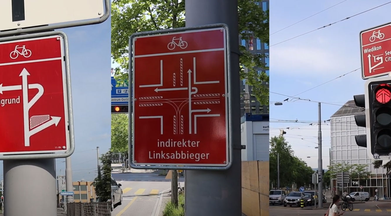 An einigen Kreuzungen in der Stadt Zürich können Velofahrer*innen anstatt auf der Autospur links abzubiegen, den indirekten Linksabbieger benutzen. Dieser enthält meistens einen zusätzlichen Stopp, ist jedoch sicherer.