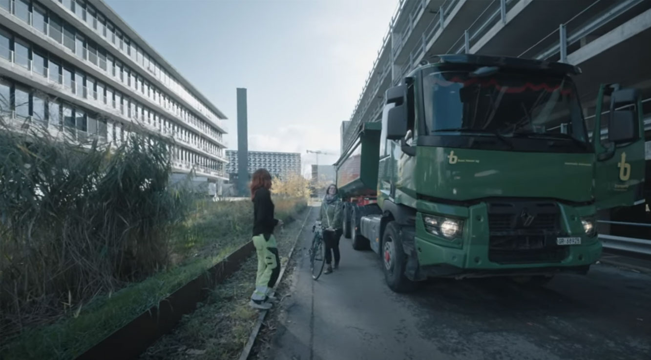 Lastwagen und andere grosse Fahrzeuge können einen toten Winkel haben, in welchem die Fahrer*innen andere Verkehrsteilnehmer*innen nicht sehen. Velofahrer*innen sollten es darum unbedingt vermeiden, sich im toten Winkel eines grossen Fahrzeugs aufzuhalten. Zudem sollte auf die Lenkbewegungen und die Blinker geachtet werden, um ein mögliches Abbiegen frühzeitig zu erkennen.