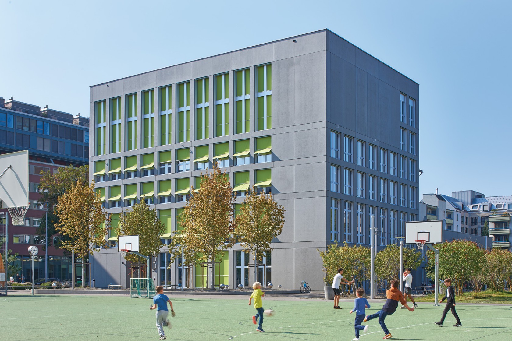 Bei der Neugestaltung des Schütze-Areals im Escher-Wyss-Quartier war die Bauaufgabe vielfältig: Vier Nutzungen – Primarschule mit Kindergarten, Sporthalle, Quartierzentrum und Pestalozzi-Bibliothek – mussten untergebracht werden. Ausserdem war ein möglichst grosser Quartierpark gefordert. Jonas Wüest Architekten gelang dieses Kunststück bestens: Das entstandene Ensemble aus Alt-, Neu- und Anbau ist ungemein kompakt und lässt dem Quartierpark zwischen Heinrich- und Limmatstrasse umso mehr Platz.