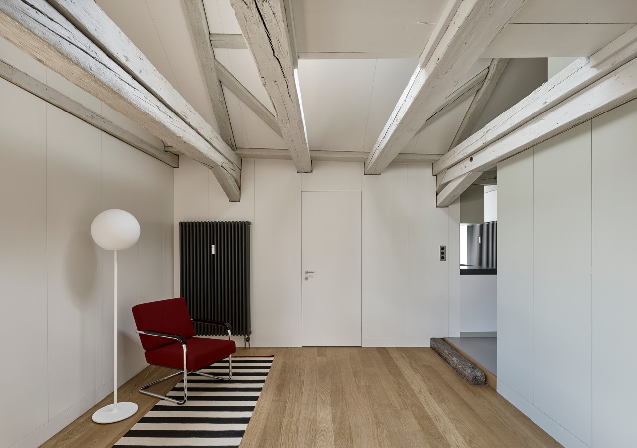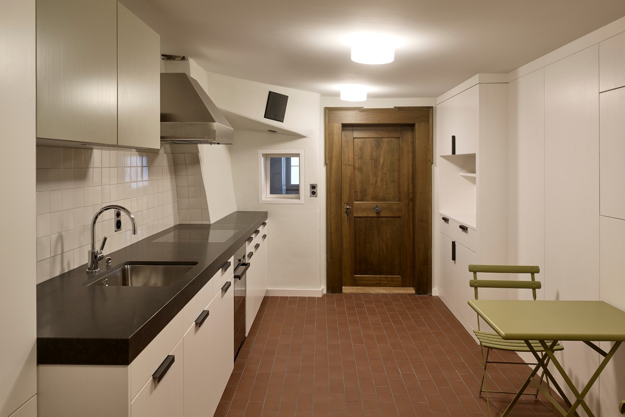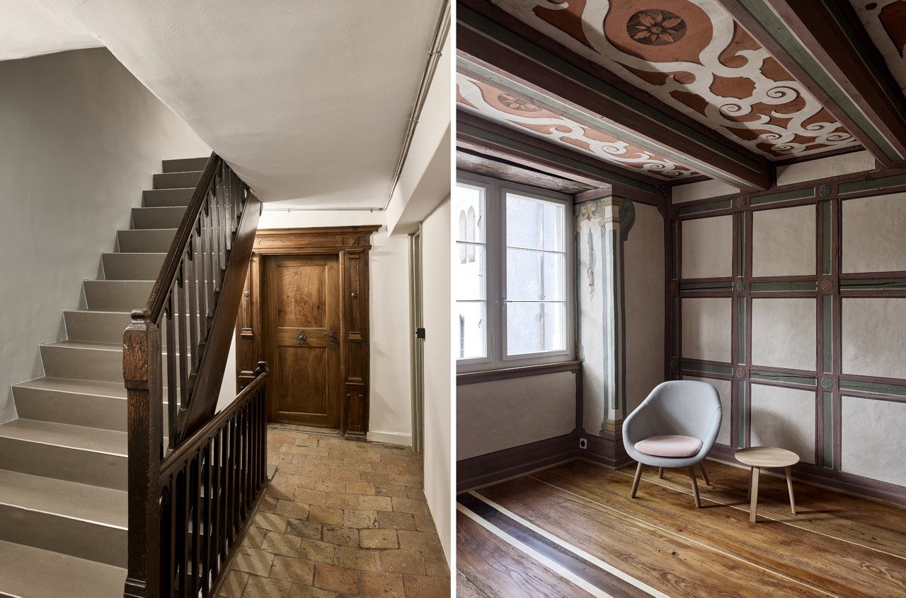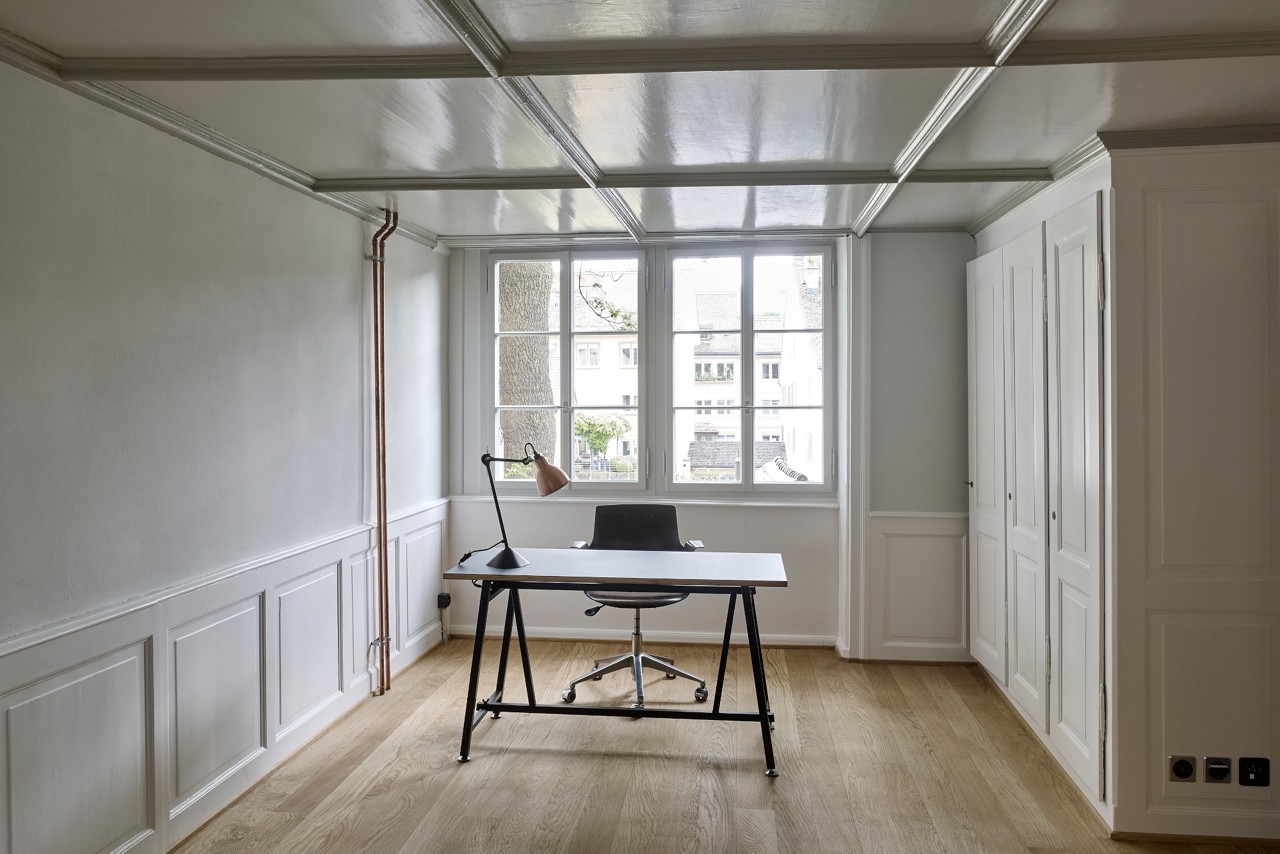 Die Raumeinteilung wurde so angepasst, dass lauter Geschosswohnungen entstanden, insgesamt fünf. Die historisch bedeutende Innenausstattung – Dekorationsmalereien, Nussbaumtüren, Steinsäulen, Stuckdecken und hochwertige Materialien – wurden sorgfältig freigelegt. Neue Fenster, die Dämmung des Daches und der Kellerdecke verbesserten die Energiebilanz. Der Lagerraum im Hofgebäude wurde im Zug der Arbeiten in ein zweites Atelier umfunktioniert.