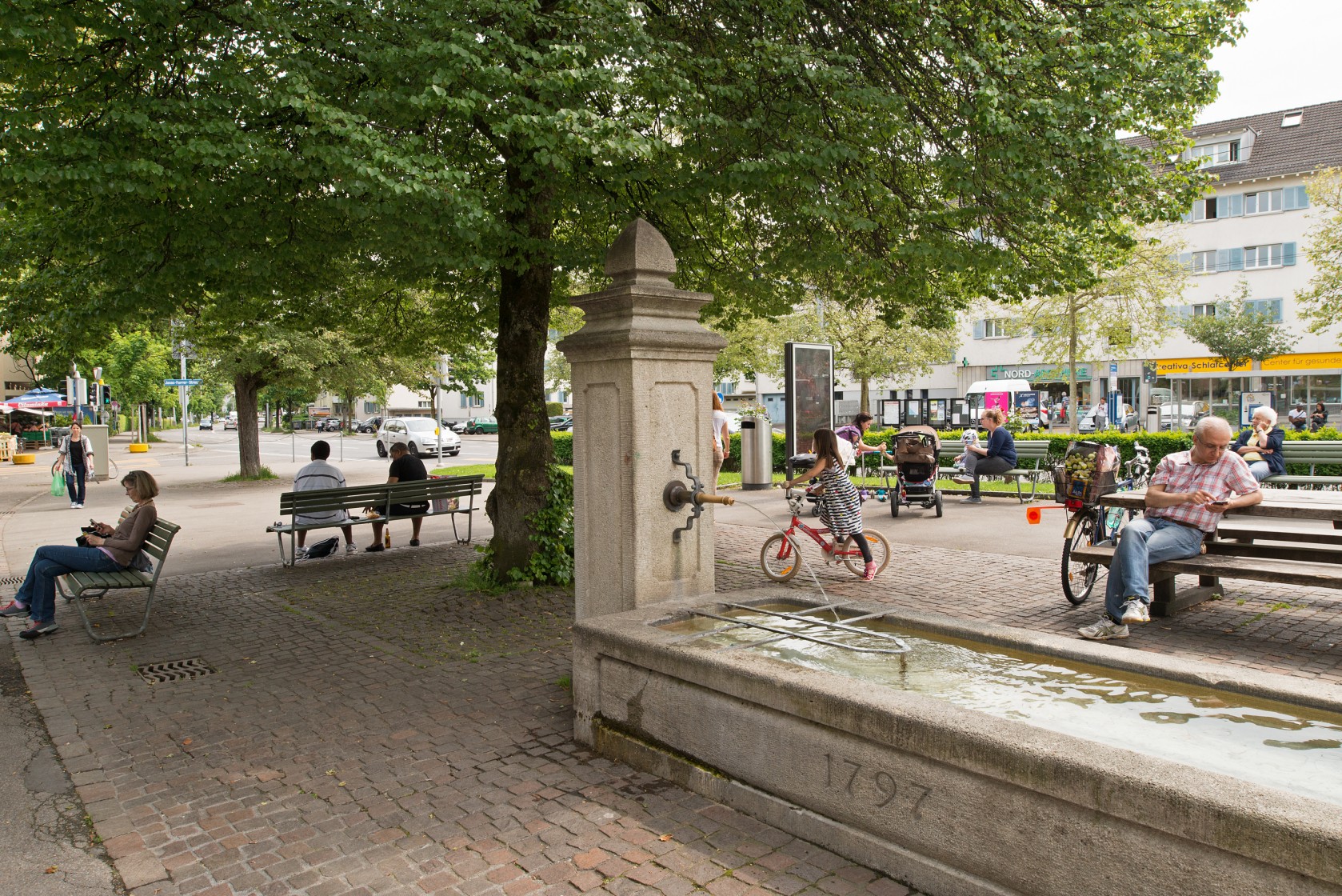 Das Herzstück des Leitbilds bildet der Zentrumsplatz an der Kreuzung Jonas-Furrer-Strasse / In Böden, zwischen Migros und Post. Das Tiefbauamt startete 2022 den Gestaltungsprozess für den Zentrumsplatz.