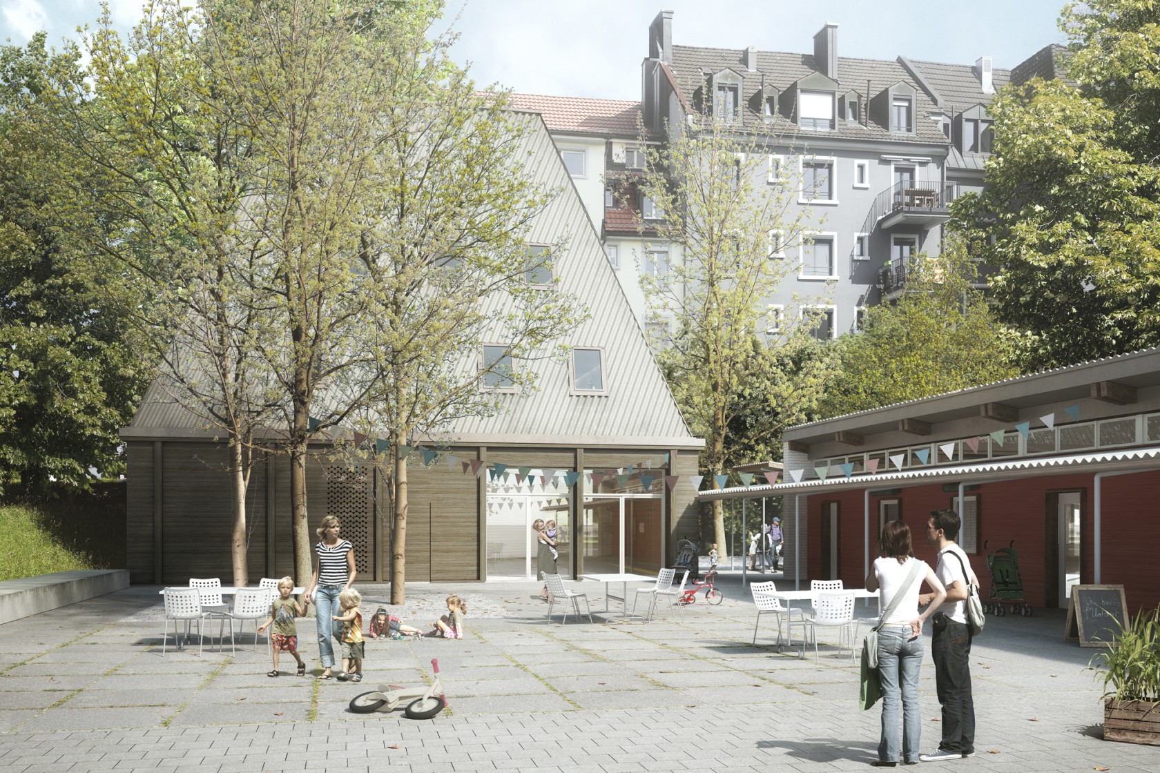 Das Ensemble von Pavillonbauten unter Bäumen ist im kommunalen Inventar der Denkmalpflege enthalten. Die architektonischen und städtebaulichen Qualitäten der Anlage sollen daher weitgehend erhalten und gestärkt werden. Aktuelle Anforderungen an den Betrieb und die Gebäudetechnik erfordern jedoch einen Ersatz des 1985 in Folge eines Brandes wiederaufgebauten Pavillons an der Ampèrestrasse 6. Der kompakte Neubau für den heutigen «Blauen Saal» ist auf der gleichen Grundfläche geplant. Das überhohe Dach und die schlichte Holzfassade zeichnen das neue Gebäude aus, in dem zudem eine Teeküche, Büro-und Serviceräume für den Betrieb, ein vielfältig nutzbarer Kursraum sowie die gebäudetechnischen Anlagen Platz finden.