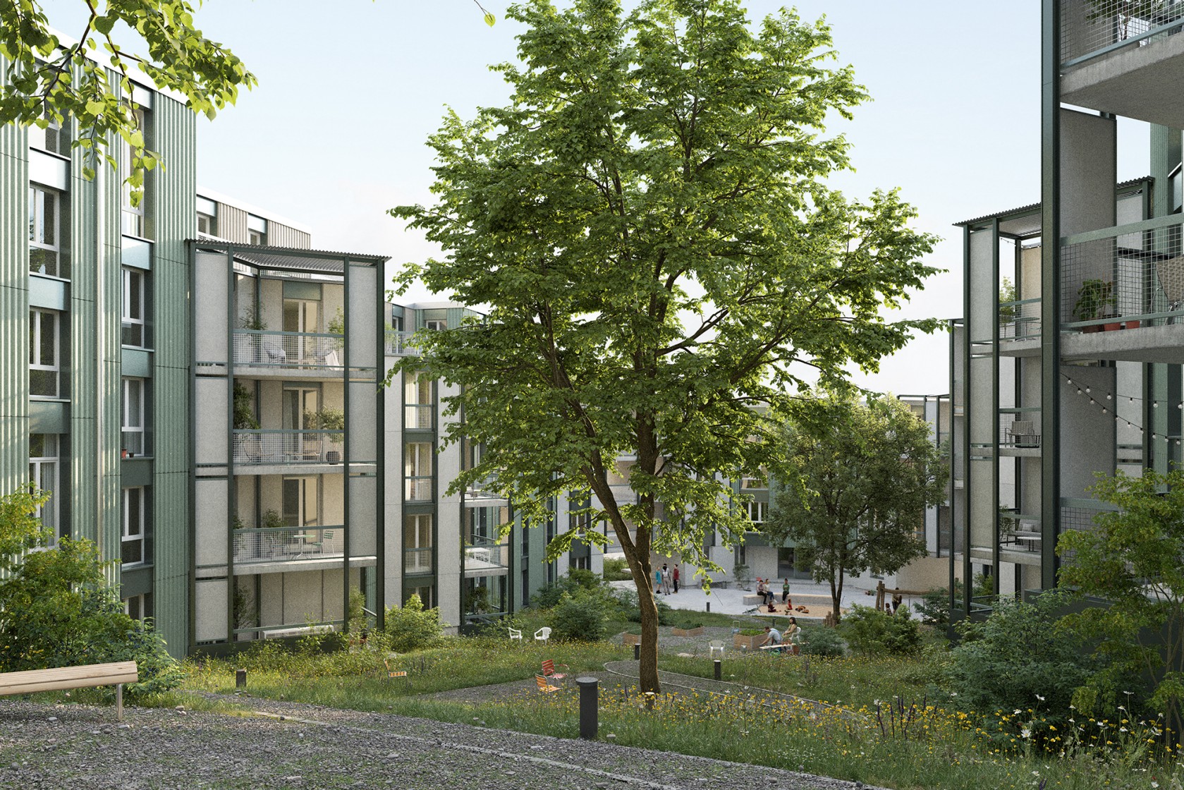 Die parallel zum Hang verlaufende Wohngasse verbindet die Zeilenbauten untereinander und führt durch begrünte vielfältige Siedlungsgrünräume. Dank der Versetzung der Bauten und die offenen Aussenräume, die wechselseitig tal- oder bergwärts angeordnet sind, entstehen im Kreuzungspunkt lebendige Orte der Begegnung für die Bewohnenden und das Quartier.