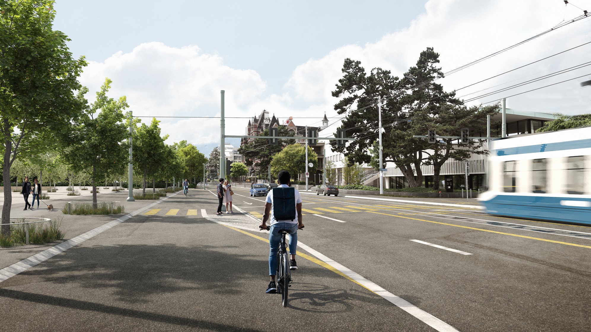 Zudem wird in der General-Wille-Strasse, zwischen der Alfred-Escher-Strasse und dem General-Guisan-Quai, ein neuer Velostreifen zulasten einer Autofahrspur markiert. Aus den Seitenstrassen erfolgt der Anschluss an den Zweirichtungs-Veloweg mit Veloquerungen parallel zu den Fussgängerquerungen.