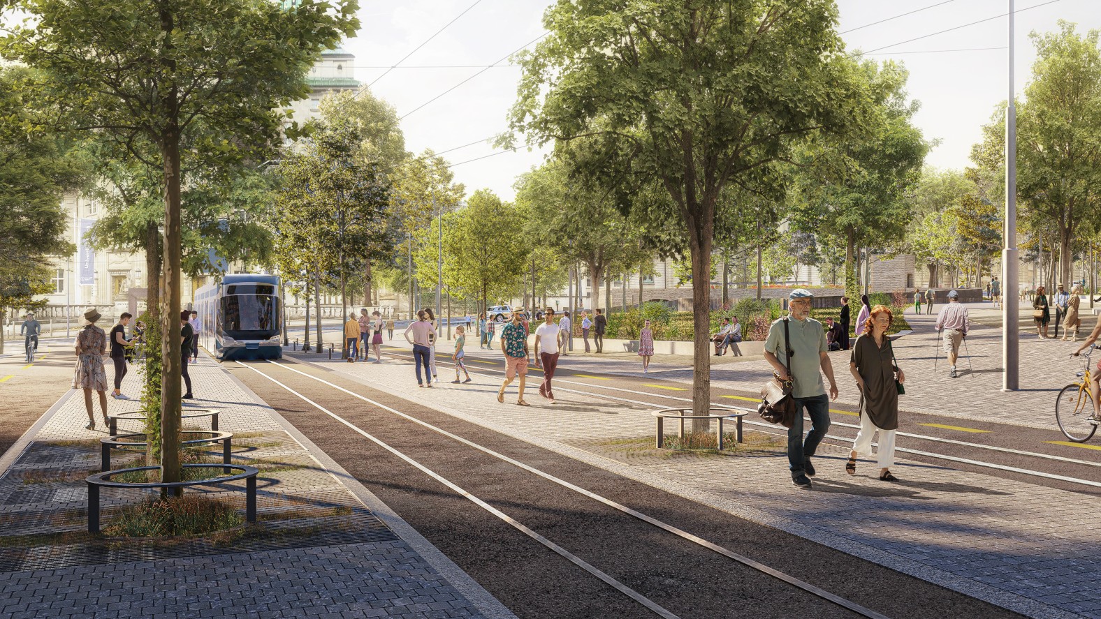 Eine der wichtigsten Massnahmen ist das sogenannte flächige Queren. Damit werden vielfältige Wegebeziehungen ermöglicht, um die zusätzlichen Fussgängerströme sicher und komfortabel zu bewältigen. Zufussgehende können direkt und einfach die Strassenseiten dort wechseln, wo es für sie nötig ist. Neben Tempo 30 vereinfachen die durchgehenden Mittelinseln entlang beider Tramtrassees die Situation, indem das Queren der Strasse in zwei Etappen möglich ist. Alle Verkehrsteilnehmenden profitieren vom langsamer fliessenden Verkehr und der gegenseitigen Rücksichtnahme.