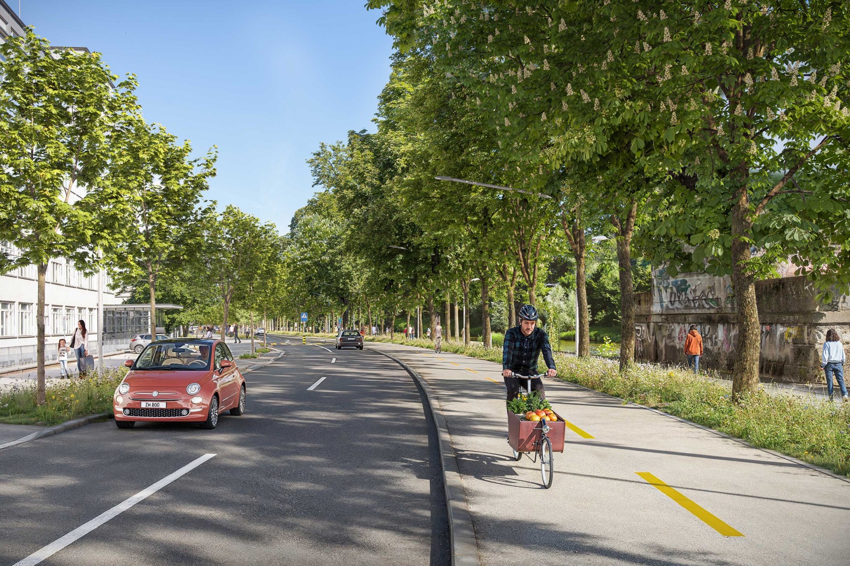 Vom Dammsteg bis zur Gerstenstrasse wird der Veloverkehr mit Velostreifen auf der Fahrbahn geführt. Dies ermöglicht einen fliessenden Übergang in den Escher-Wyss-Platz.