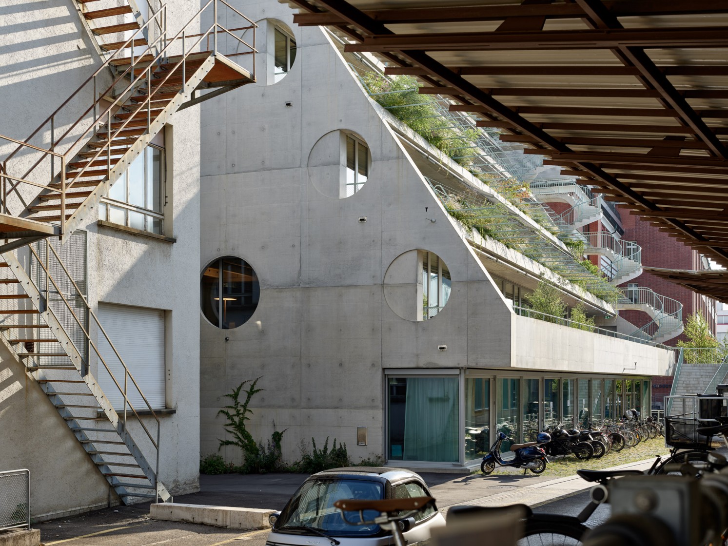 In ländlicher Umgebung am Stadtrand erbaut, erinnert das neue Wohnhaus mit seinem Volumen und seinen Vordächern an landwirtschaftliche Nutzbauten. Innen dagegen ist es höchst unkonventionell. Die 14 Wohnungen können als einziges Raumkontinuum genutzt oder durch Schiebewände in mehrere Zimmer unterteilt werden, auch ungewöhnliche Kombinationen sind dabei möglich. Im Erdgeschoss teilen sich die Bewohnenden eine grosse gemeinsame Küche samt Ess- und Kaminbereich sowie einen Waschsalon, und auch der Garten ist gemeinschaftlich. Dank Solarmodulen auf dem Dach für Strom und Warmwasser produziert das Haus mehr Energie, als es verbraucht.