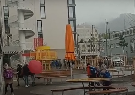 Für das Areal der Schulanlage Allmend hat Roland Roos einen Springbrunnen entwickelt, der ohne externe Energie- und Wasserquelle betrieben wird und sich gewissermassen selbst ermöglicht. Er sprudelt nur dann, wenn es regnet und nur so stark, wie es regnet. Dann spritzt der Brunnen, einst Sinnbild für Luxus und ständige Verfügbarkeit, dem fallenden Regen entgegen. Das auf dem Dach gesammelte Regenwasser dient dem Brunnen als Quelle, der in der Fallleitung vorhandene Druck bestimmt unmittelbar die Sprühkraft der Anlage, und durch eine rotierende Düse sucht sich der Wasserstrahl seine wilden Wege.