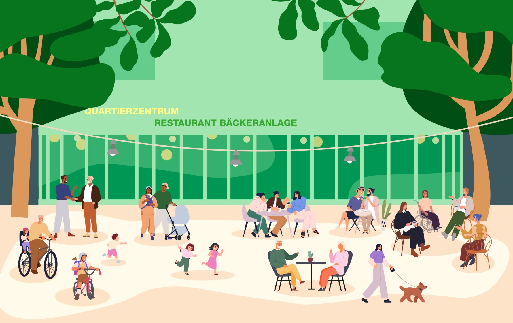 Das Quartierzentrum Bäckeranlage ist eine kleine, grüne Oase inmitten des quirligen Kreis 4. Grosse, schattenspendende Bäume und zahlreiche Bänke laden Gross und Klein zum Verweilen ein. Das Restaurant mit grossem Innen- und Aussenbereich sorgt den ganzen Tag fürs leibliche Wohl. Die Räume in den Obergeschossen können gemietet werden und es finden zahlreiche Veranstaltungen vom und für das Quartier statt.