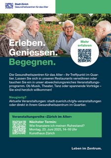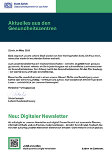 Immer informiert – jetzt einfacher denn je. Unser Newsletter «Aktuelles aus den Gesundheitszentren für das Alter» präsentiert sich neu im modernen Layout und bietet spannende Einblicke in unsere Angebote, Aktuelles, Veranstaltungshinweise und vieles mehr.