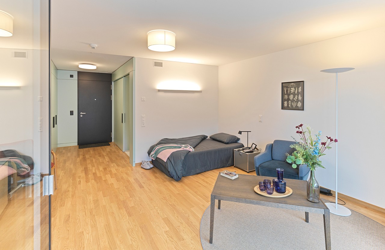Für Menschen, die gemeinschaftliches Wohnen schätzen, gibt es die Möglichkeit für eine Wohngemeinschaft. Die vier 1-Zimmer-Appartements mit eigenem Badezimmer verfügen über ein grosszügiges Gemeinschaftswohnzimmer und eine gemeinsam genutzte Küche.