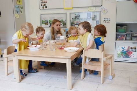 - Für die jüngeren Kinder werden saisonale Variationen von Gemüsebreis angeboten. Die Kita bietet ein Folgemilchprodukt an; auf Wunsch können die Eltern ein anderes Produkt mitbringen, für dessen Kosten sie selbst aufkommen müssen.