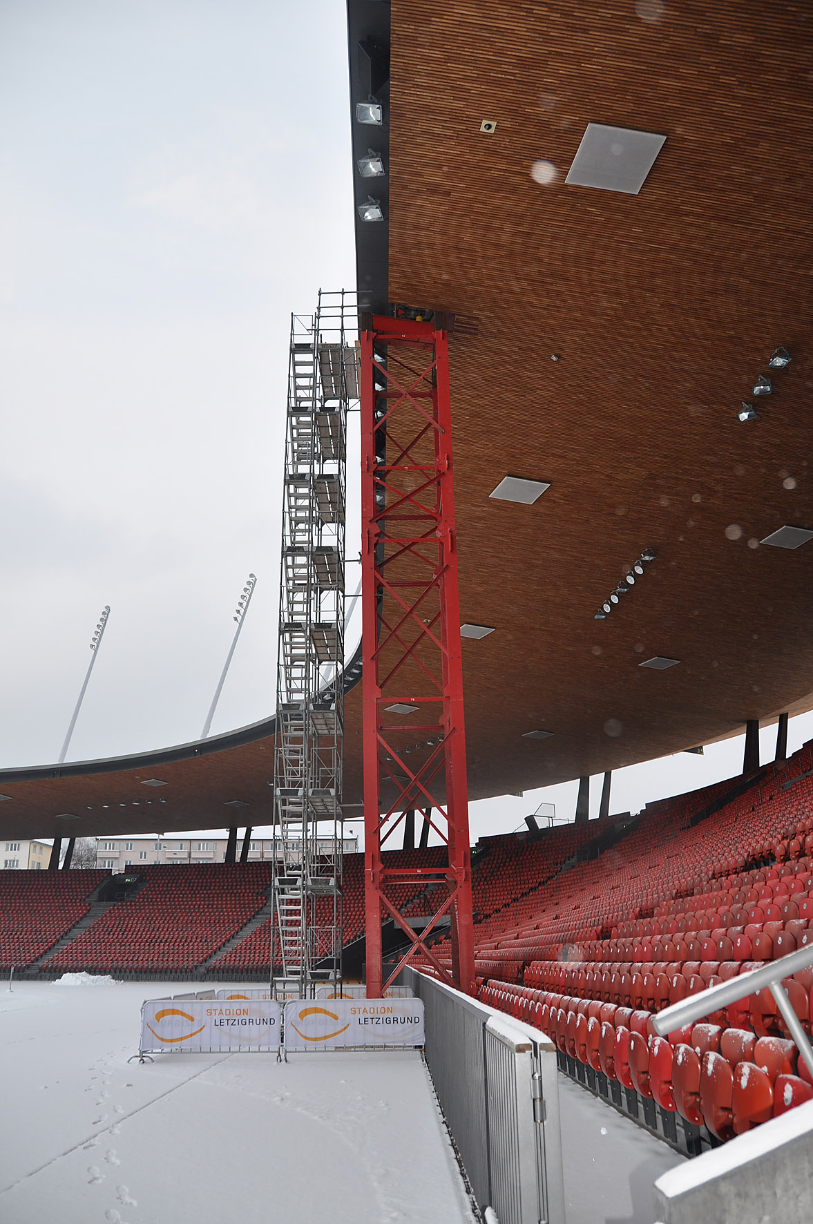1. März aus Sicherheitsgründen geschlossen. Die Experten werden die Untersuchungen am Dach mit zusätzlichen technischen Verfahren fortführen. Diese sollen den Einblick in das Innere der Stahlträger ermöglichen. Die 31 Träger befinden sich mehrheitlich im Innern der Holzverkleidung der Stadiondecke. Die Untersuchungen sind deshalb sehr aufwändig und müssen über das Dach durchgeführt werden.