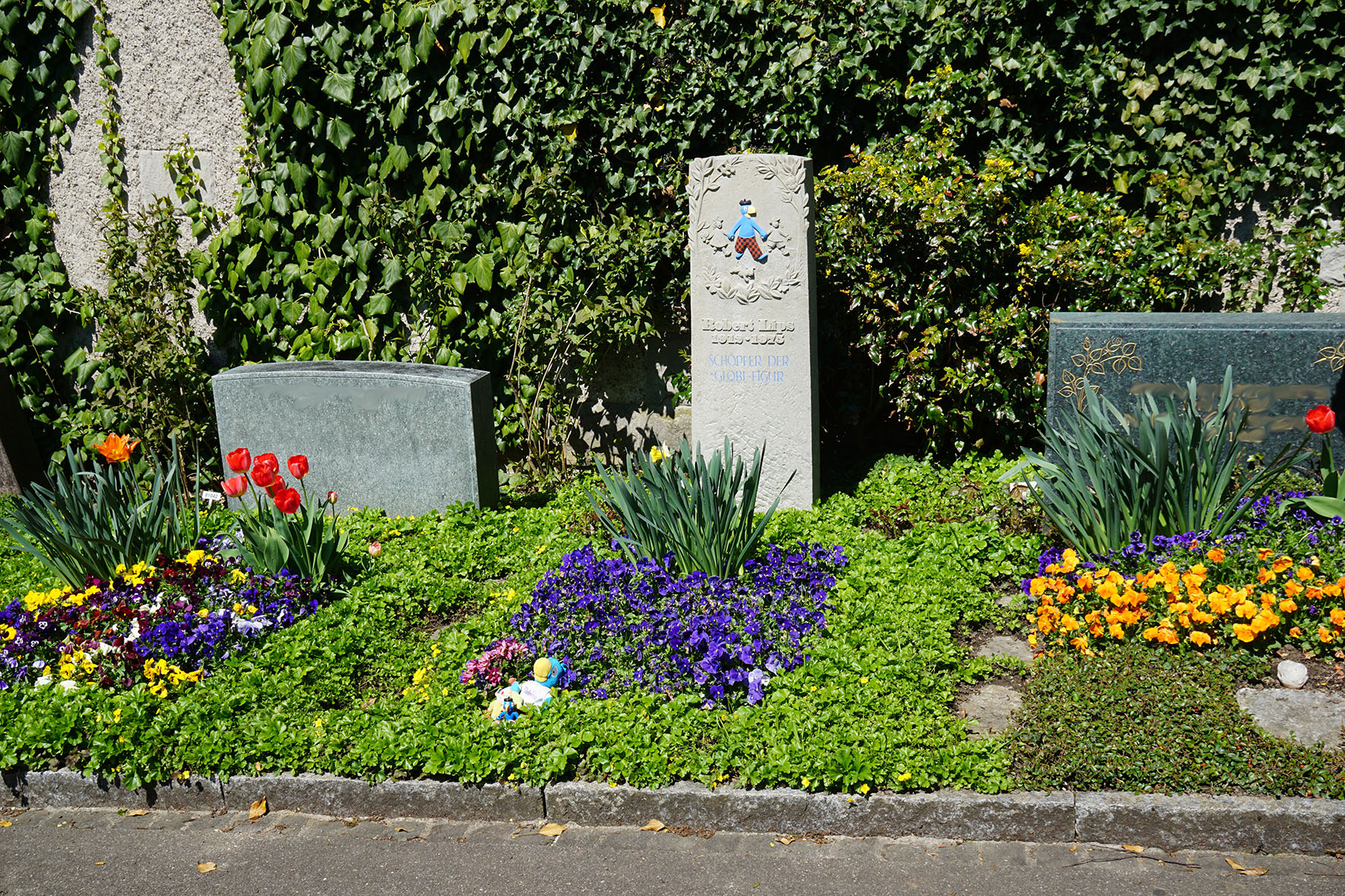 Damit das Grabmal des Grafikers und Zeichners Robert Lips auch für die Zukunft in einem würdigen Zustand erhalten bleibt, hat das Bestattungs- und Friedhofamt den Grabstein diesen Frühling instand gesetzt. Der Bildhauer Daniele Trebucchi reinigte den Buchberger Sandstein und frischte das Relief, das Globi mit zwei Kindern zeigt, mit UV-stabilen und witterungsbeständigen Silikat-Farben auf.