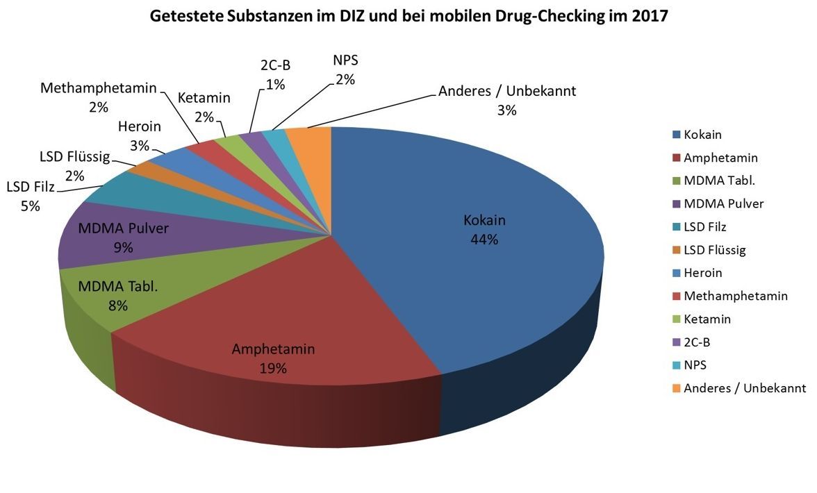 Spitzenreiter war 2017 mit fast der Hälfte der eingereichten Proben erneut Kokain (44 Prozent; 901 Proben), gefolgt von Amphetamin (19 Prozent) und MDMA-Pillen oder -Pulver (17 Prozent). Substanzen wie Methamphetamin, Ketamin oder die sogenannten neuen psychoaktiven Substanzen (NPS) wurden vergleichsweise selten getestet (je 2 Prozent). Cannabis kann nicht analysiert werden.
