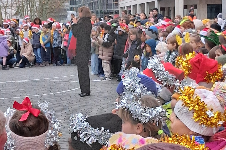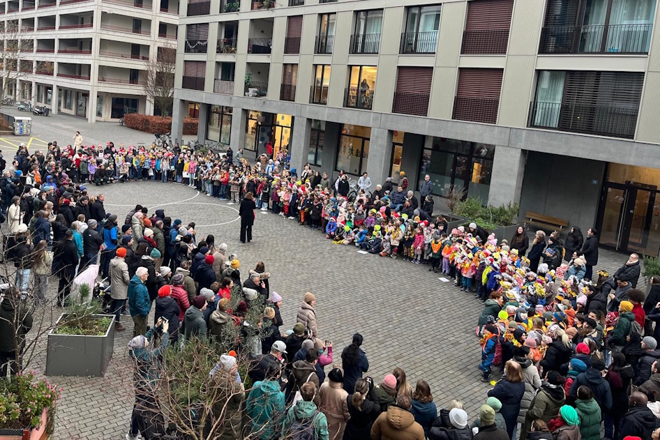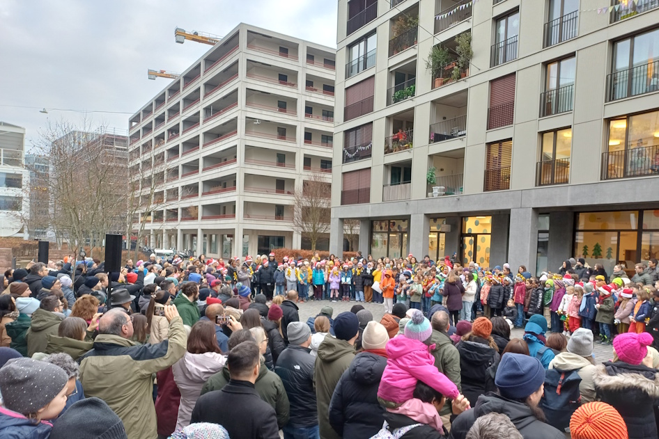 Der letzte Schultag des Jahres 2025 fand seinen feierlichen Abschluss im traditionellen Jahresschlusssingen, zu dem die Eltern herzlich eingeladen waren. Erstmals versammelten sich alle Schülerinnen und Schüler auf dem Maneggplatz, um gemeinsam zu singen. Wir sind überwältigt von der besonderen Wirkung dieses Jahresschlusssingens im öffentlichen Raum, das sich zu einem stimmungsvollen Anlass für das ganze Quartier entwickelt hat.