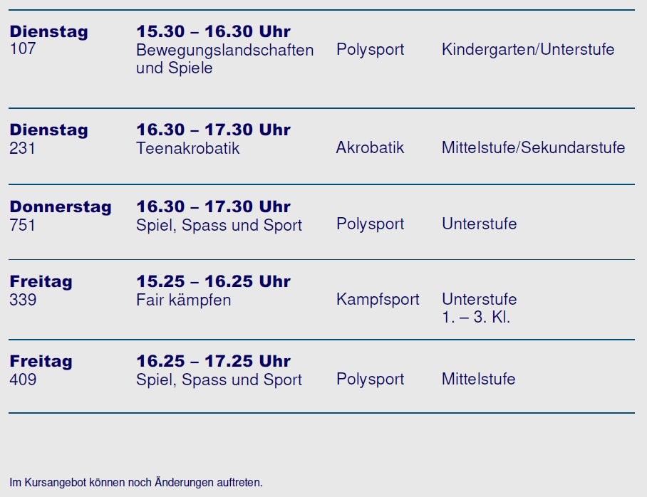 Unserer Schule ist es ein Anliegen, auch in der unterrichtsfreien Zeit verschiedene Freizeitaktivitäten anzubieten. In Zusammenarbeit mit dem Sportamt der Stadt Zürich bieten wir an der Schule Altweg folgende Schulsportkurse an.