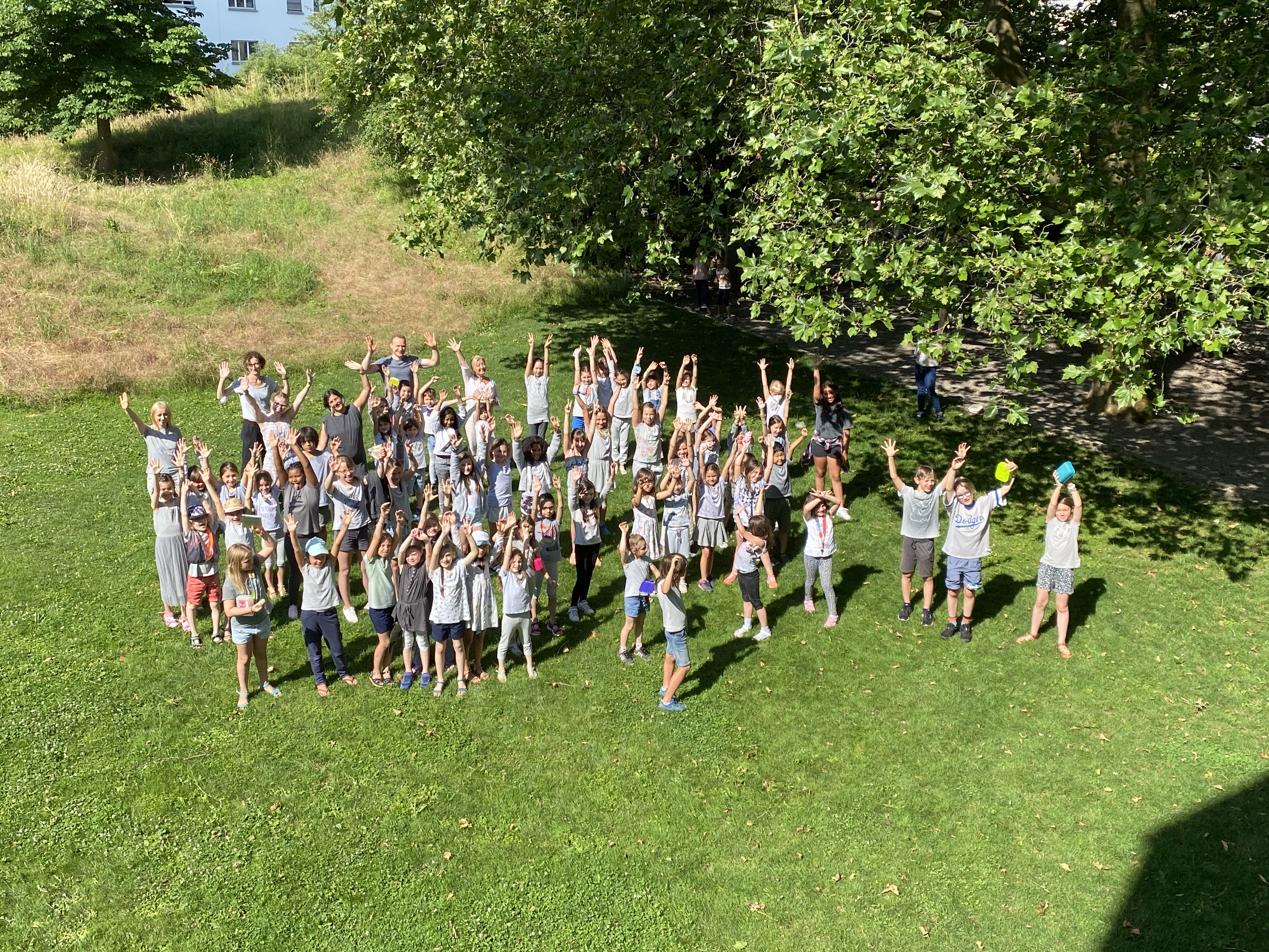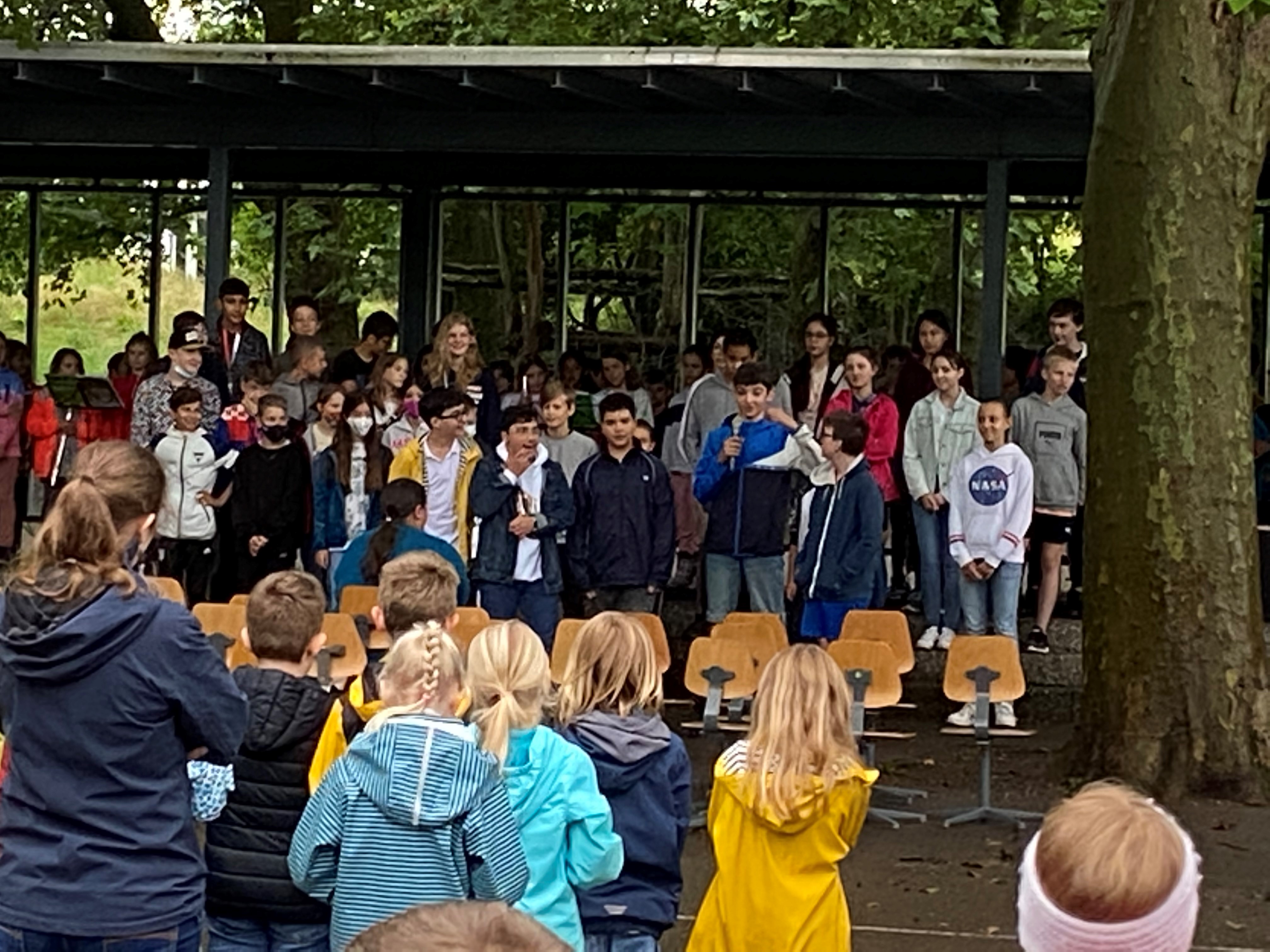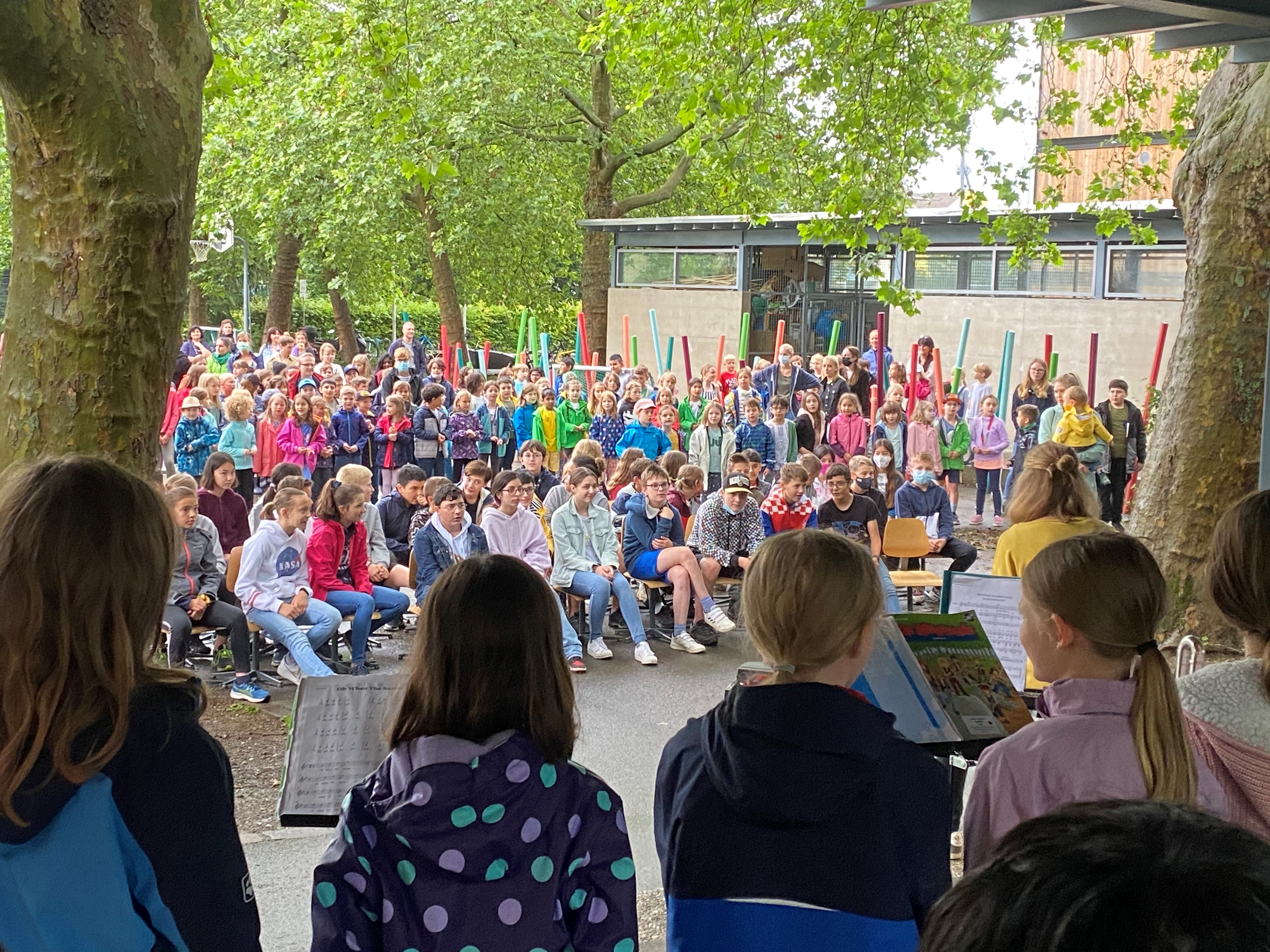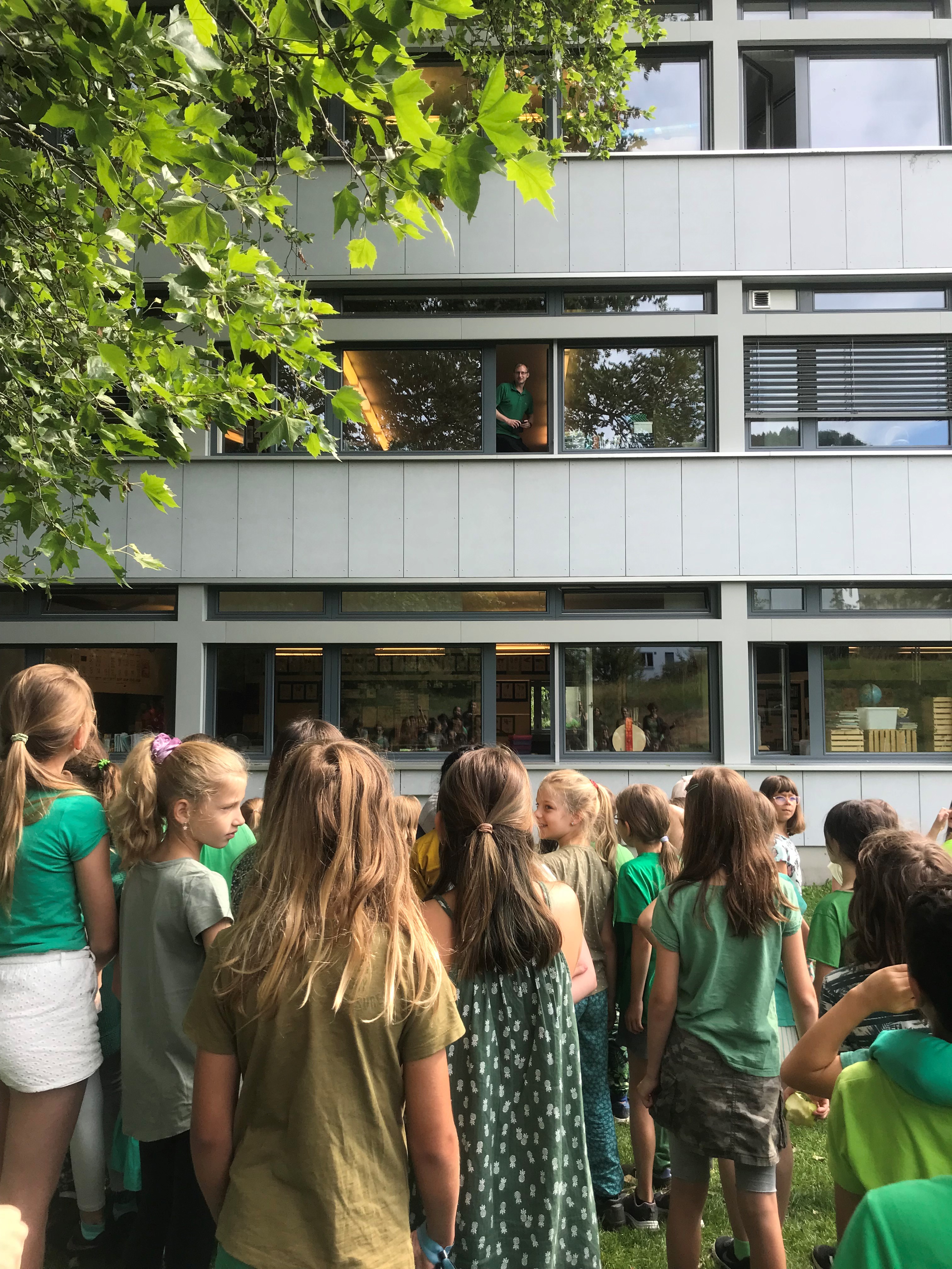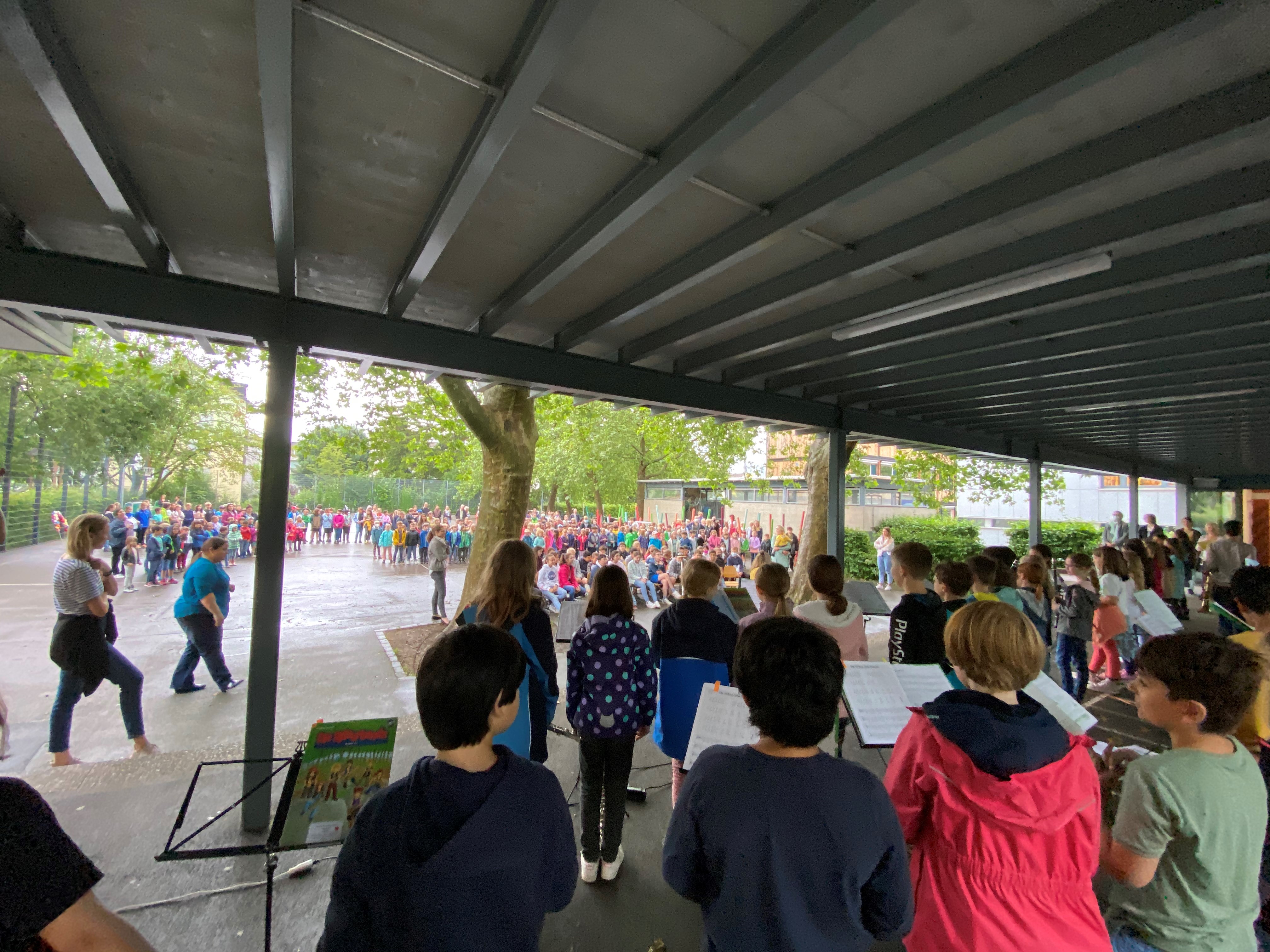 Die Schülerinnen und Schüler der 6. Klassen wurden musikalisch von allen Kindern, Lehr- und Betreuungspersonen verabschiedet. Machets guet!