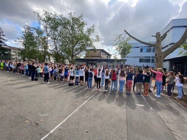 Wir setzen als Schule ein Zeichen für Frieden, Liebe und Freundschaft. Diese Symbole haben Schüler/innen aus allen Klassen und Stufen gezeichnet und draussen auf dem Schulhausplatz aufgehängt.