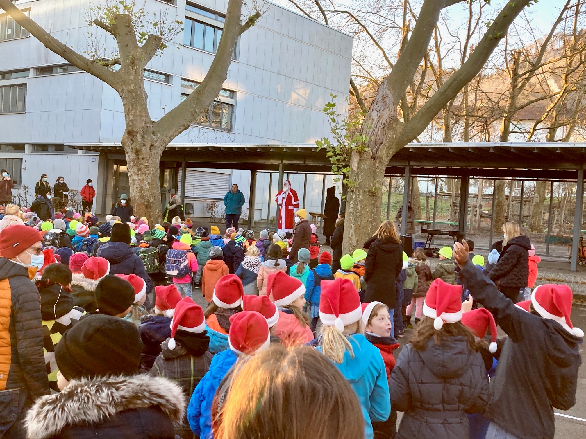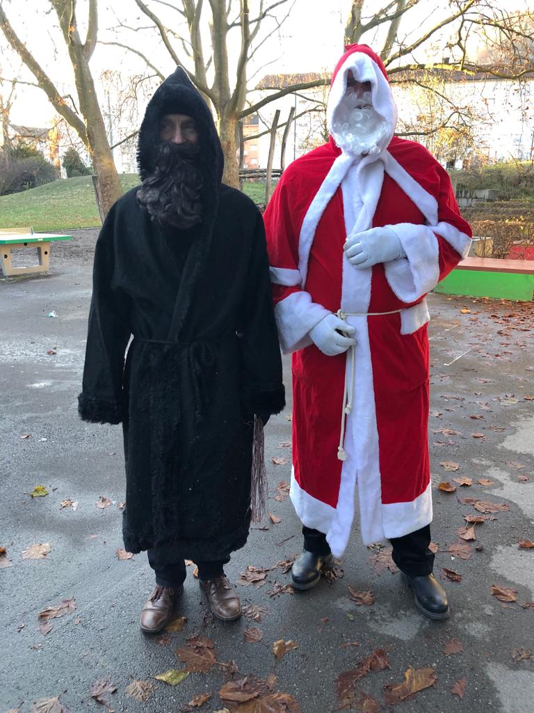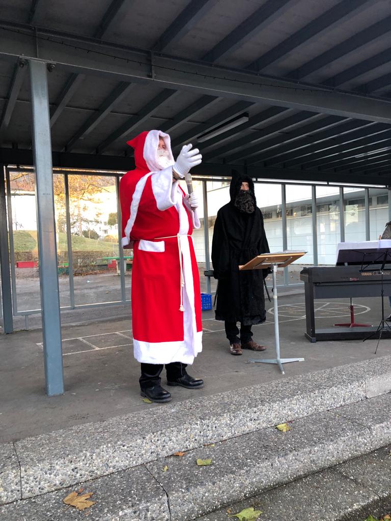 Aufgrund der intensiven Zeit am 6. Dezember besuchte der Samichlaus und der Schmutzli unser Schulhaus dieser Jahr etwas früher. In einem grossen Sack brachten sie Nüssli, Mandarinen und etwas Süsses mit. Als Dank sangen die Schülerinnen und Schüler schöne Weihnachtslieder.