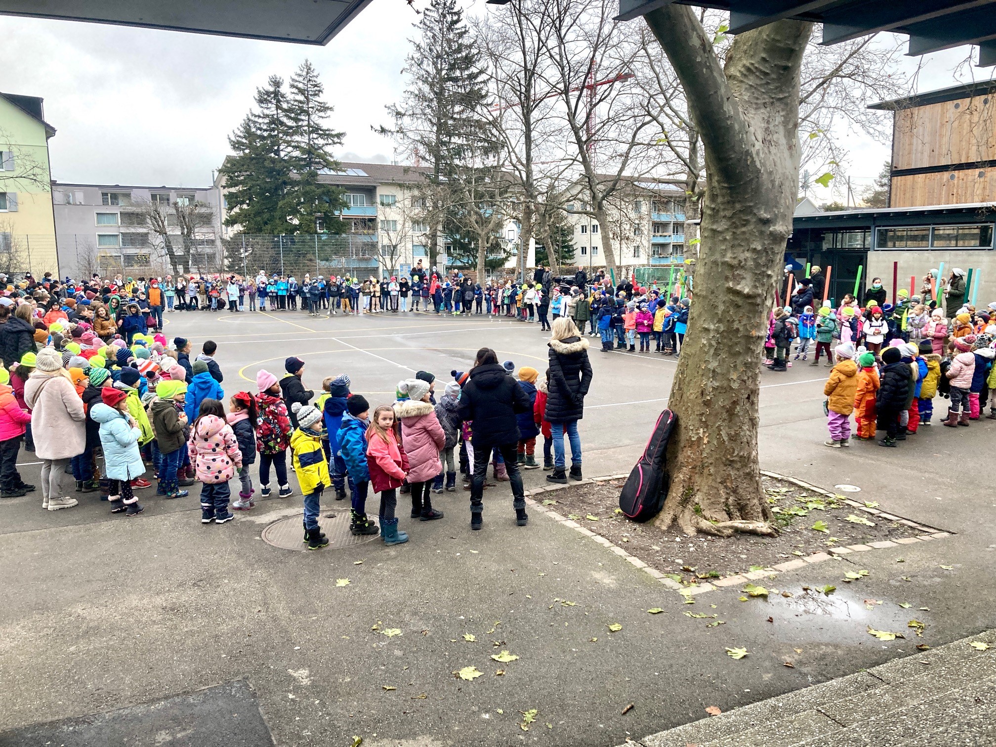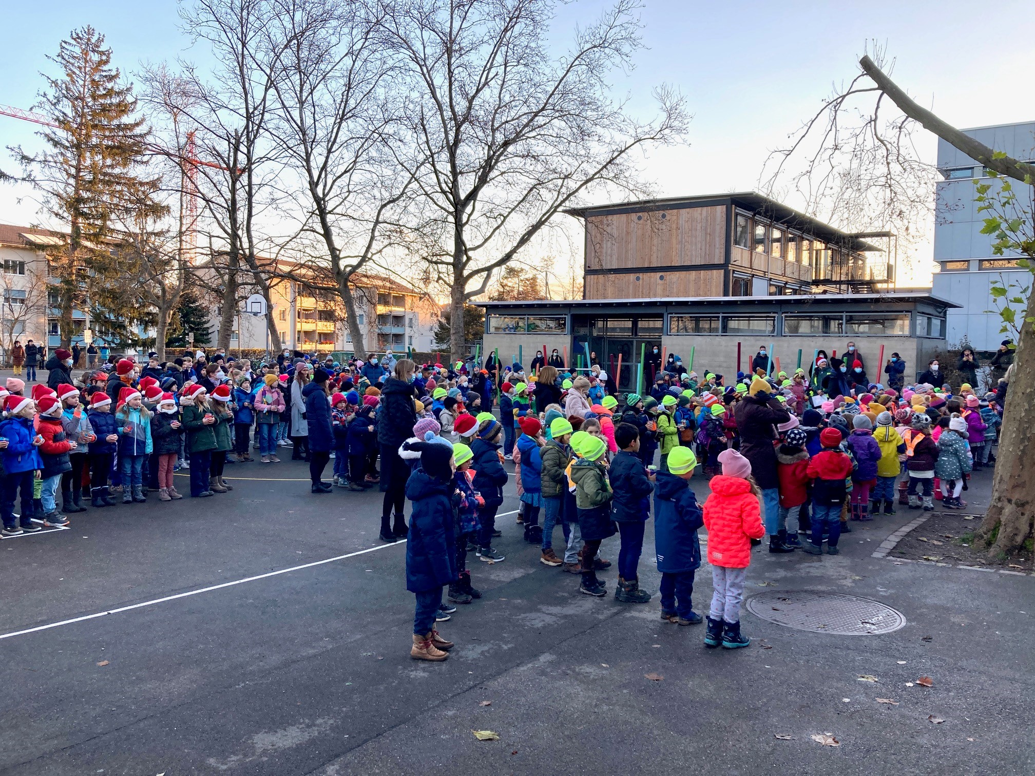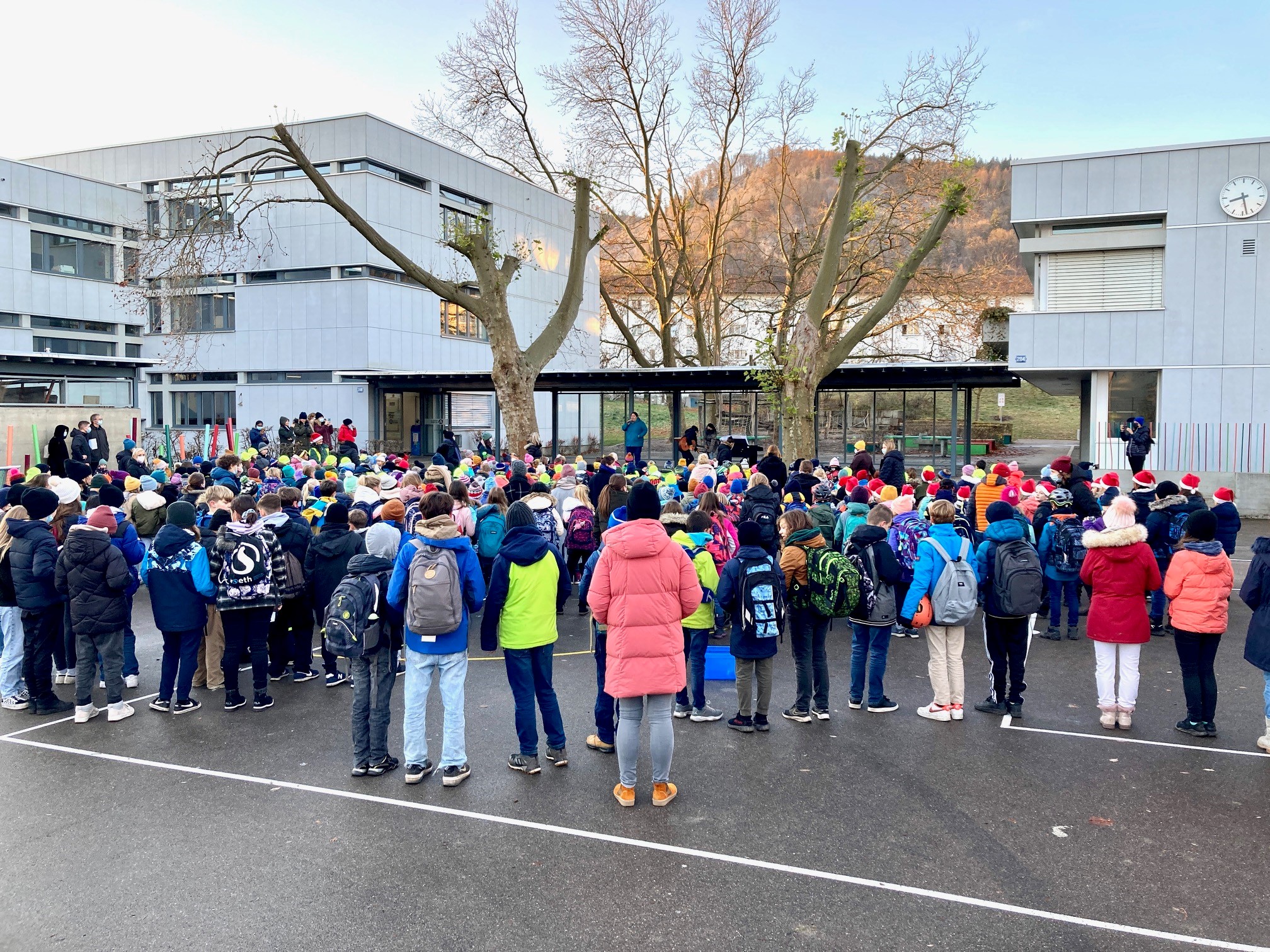 Aufgrund der intensiven Zeit am 6. Dezember besuchte der Samichlaus und der Schmutzli unser Schulhaus dieser Jahr etwas früher. In einem grossen Sack brachten sie Nüssli, Mandarinen und etwas Süsses mit. Als Dank sangen die Schülerinnen und Schüler schöne Weihnachtslieder.