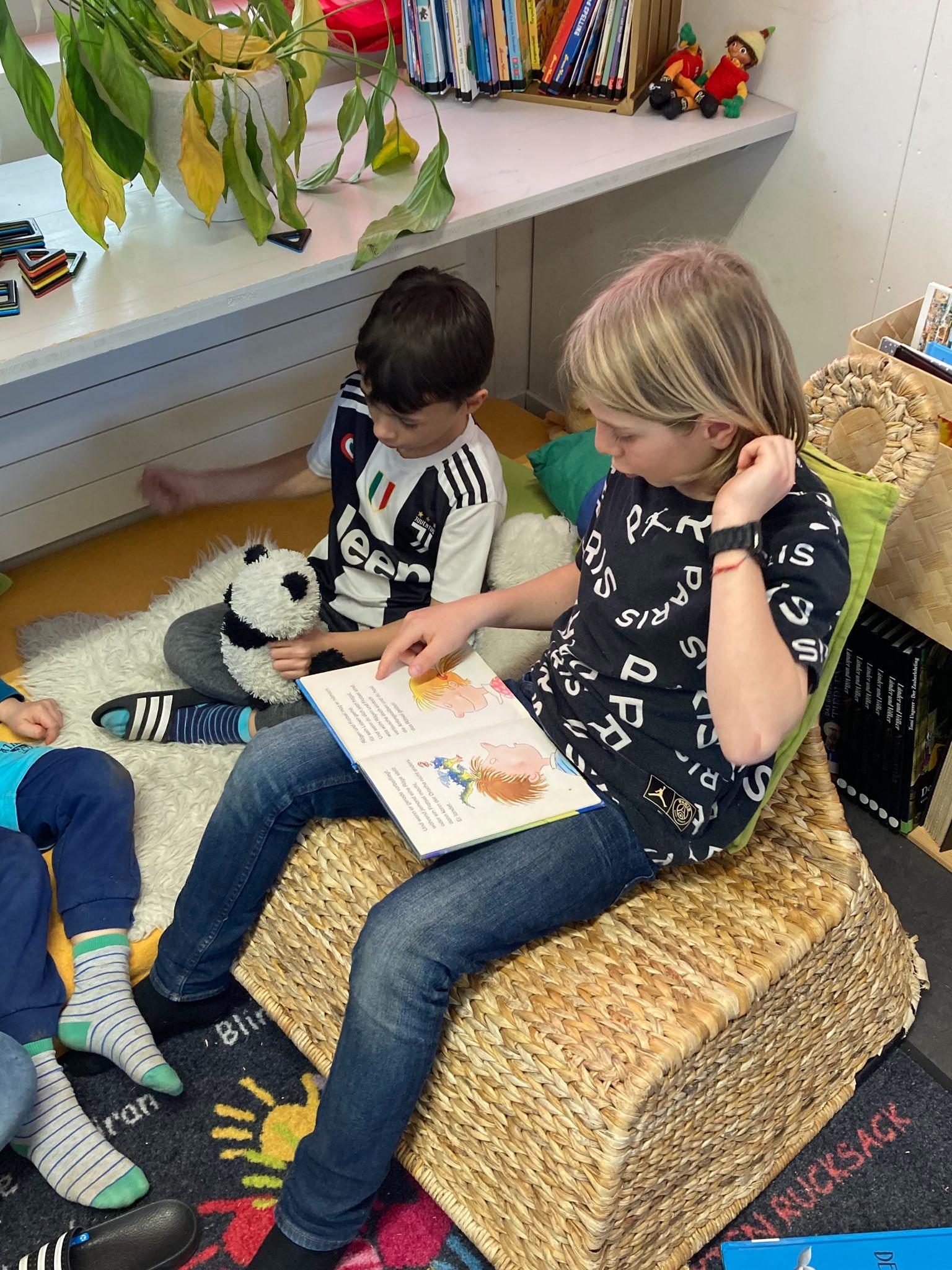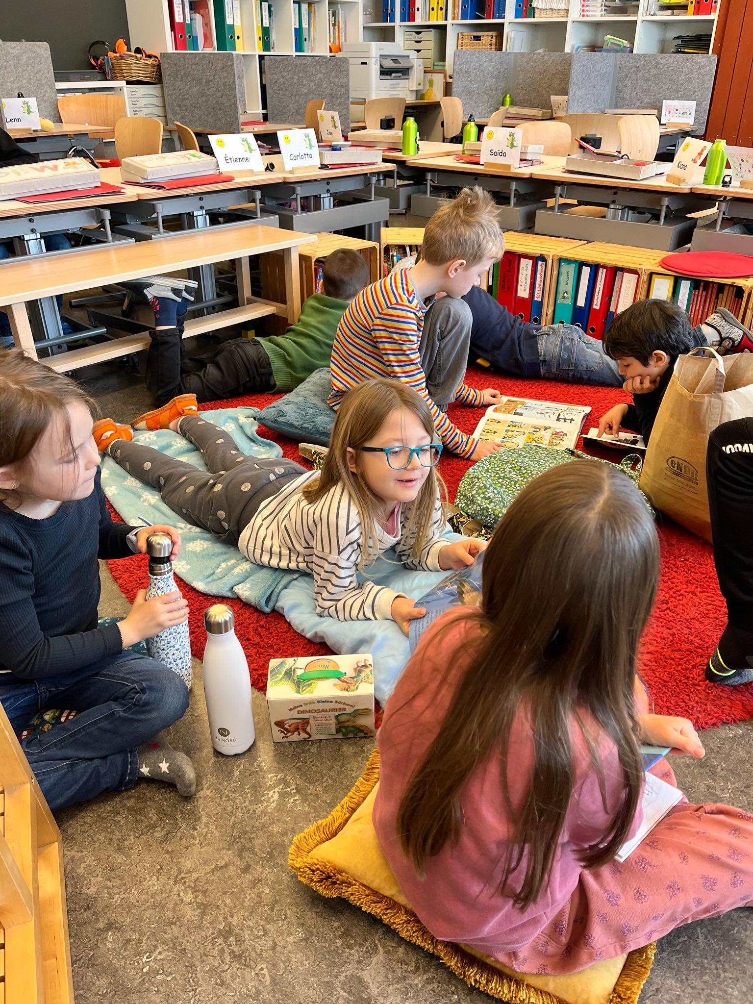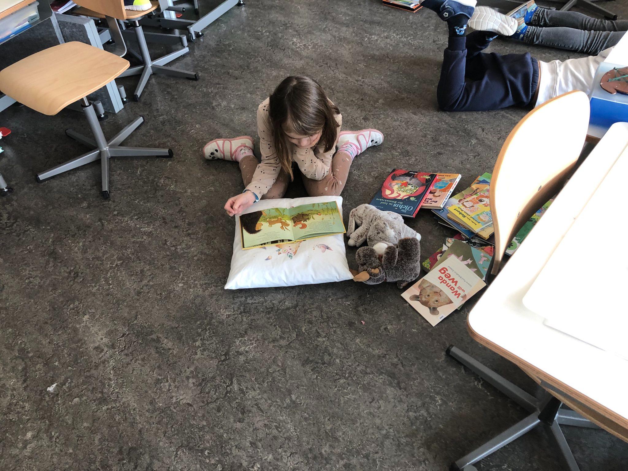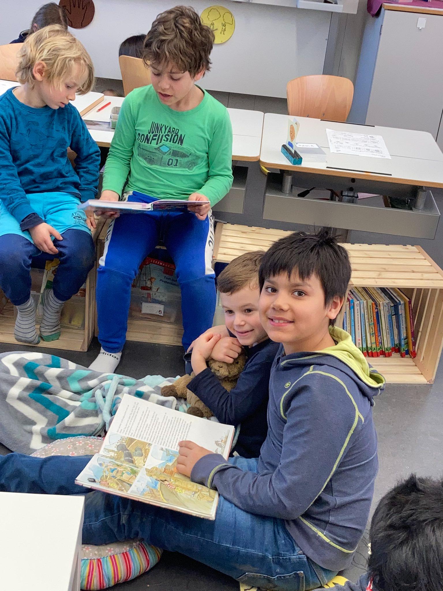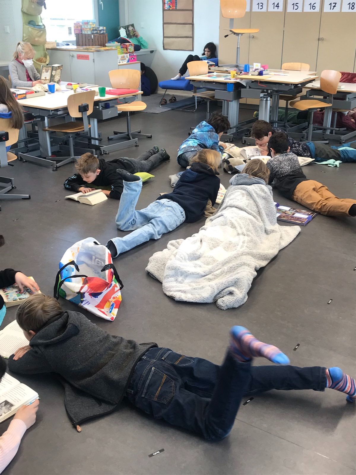 Als Projekt zur Förderung der Lesemotivation und der Lesekompetenz führten wir eine gesamtschulische Lesewoche durch. In allen Klassen wurde täglich während mindestens einer Lektion selber gelesen, gemeinsam gelesen und auch vorgelesen. Damit die Kinder es richtig geniessen konnten, durften sie es sich in den Klassenzimmern mit selbstmitgebrachten Kissen, Decken und Kuscheltieren gemütlich machen. Im Gesamten wurden während der Lesewoche sage und schreibe 595 Bücher «verschlungen». Wow!