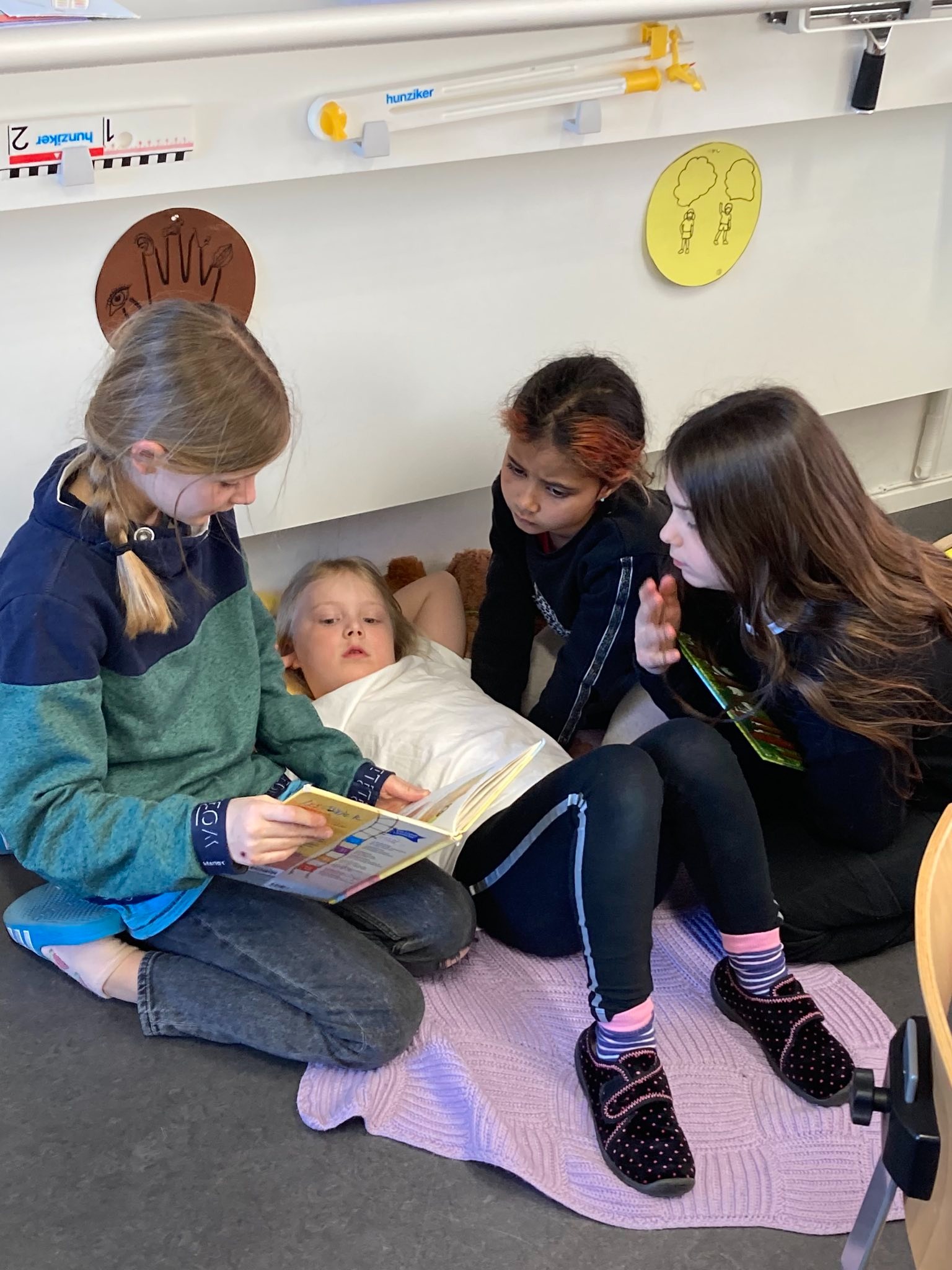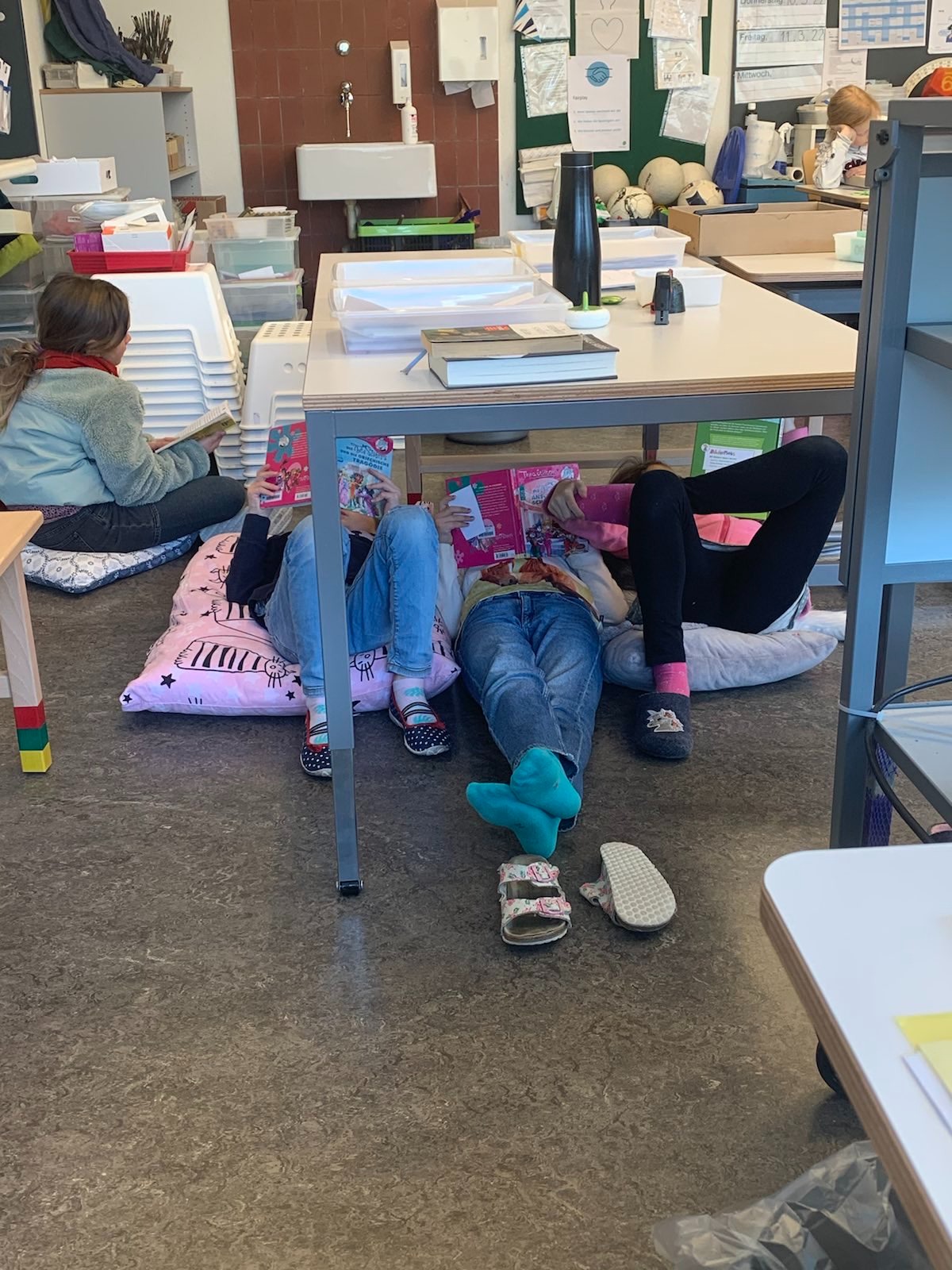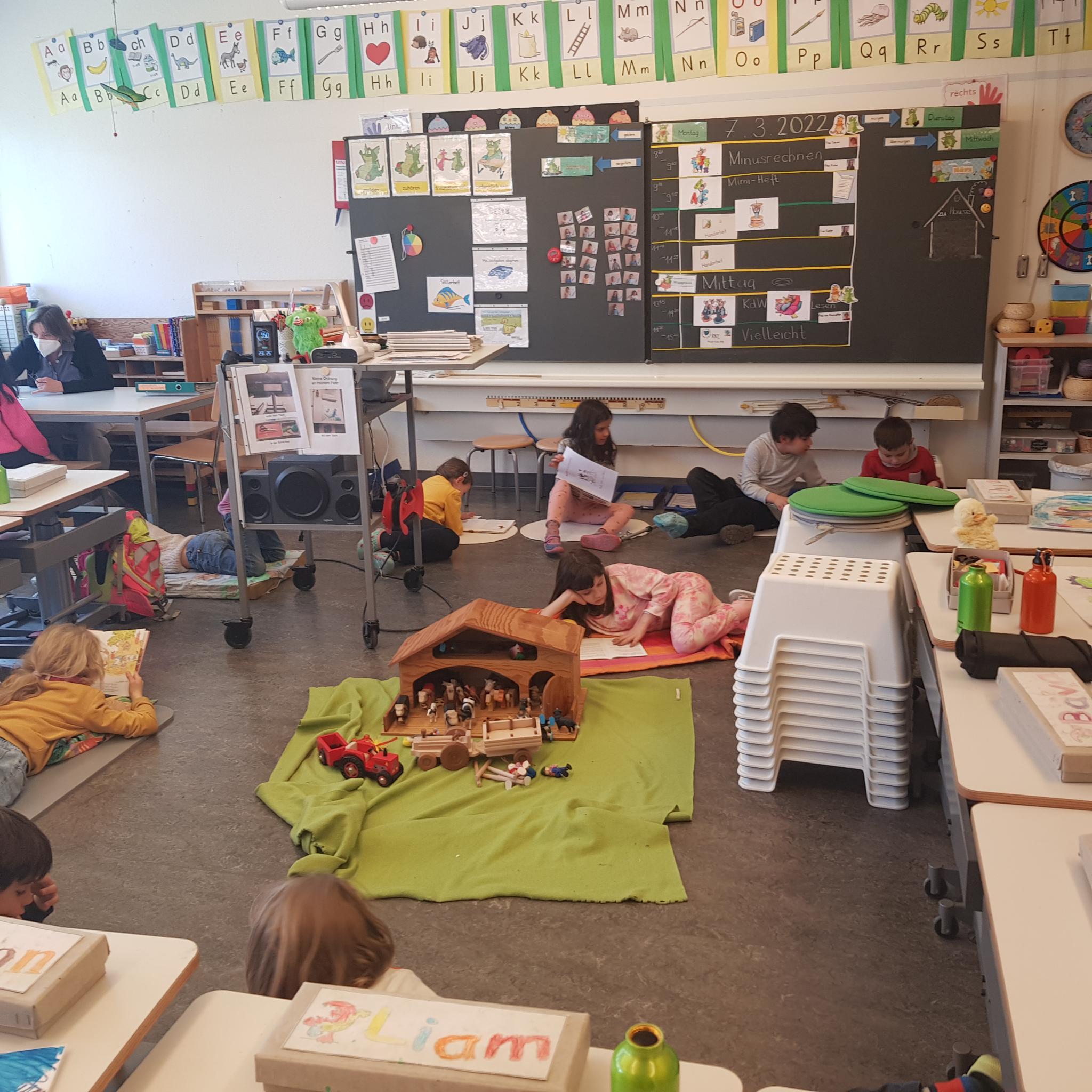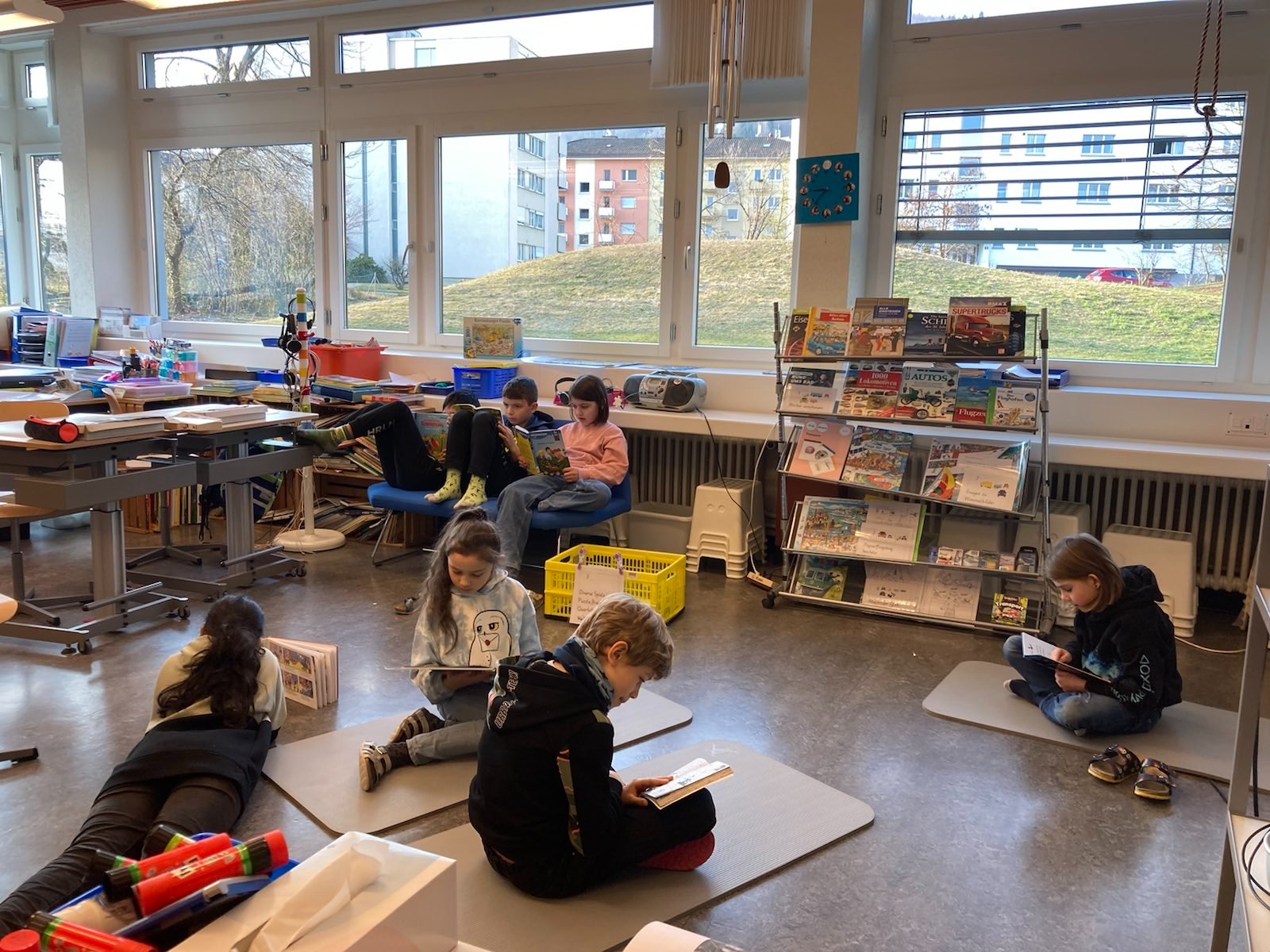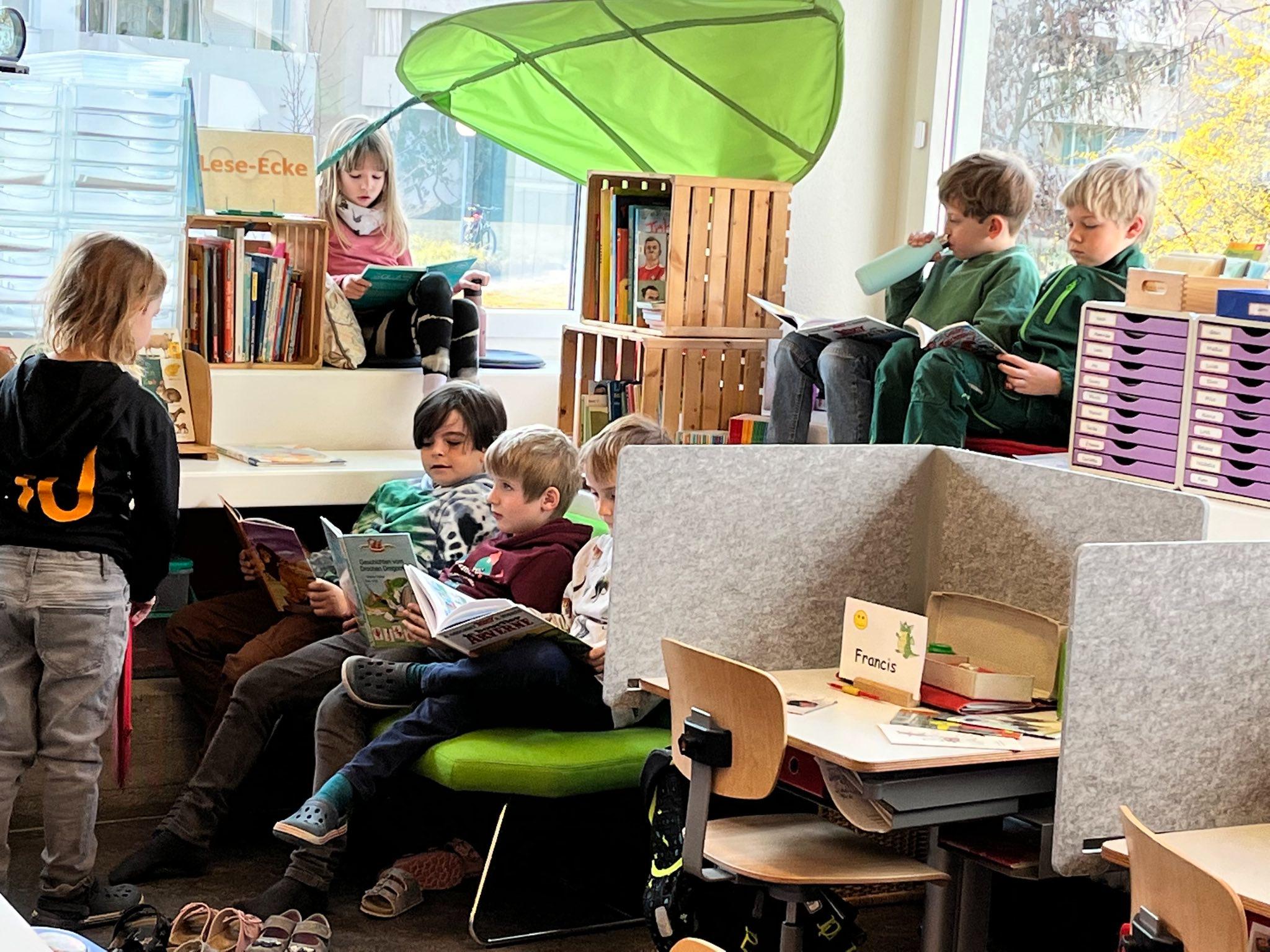 Als Projekt zur Förderung der Lesemotivation und der Lesekompetenz führten wir eine gesamtschulische Lesewoche durch. In allen Klassen wurde täglich während mindestens einer Lektion selber gelesen, gemeinsam gelesen und auch vorgelesen. Damit die Kinder es richtig geniessen konnten, durften sie es sich in den Klassenzimmern mit selbstmitgebrachten Kissen, Decken und Kuscheltieren gemütlich machen. Im Gesamten wurden während der Lesewoche sage und schreibe 595 Bücher «verschlungen». Wow!