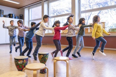 Die Kinder erleben ihre Stimme als eigenes Instrument und erlernen damit ein Liedrepertoire. Sie lernen mit verschiedenen Musikinstrumenten u.a. rhythmische Ostinati und Melodien zu spielen. Ein vielseitiges Instrumentarium steht ihnen dabei zur Verfügung wie Orff- und Elementarinstrumente, Xylophon, Djembe usw. Vielfältige Spiele, Tänze, Bewegungs- und Ausdrucksformen ergänzen den Unterricht.