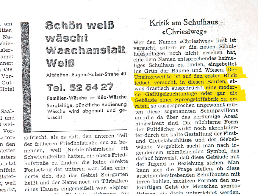 1947 zeichnete die Stadt Zürich zum ersten Mal besonders gelungene Bauten aus. Da diese Auszeichnung bei Architekten und Bauinteressierten grossen Anklang fand, wiederholte man die Prämierung alle drei bis vier Jahre, 1957 zum vierten Mal. Das Hochbauamt erstellte jeweils eine Liste von über 500 Bauten, 170 davon wurden durch die Jury vor Ort in architektonischer und städtebaulicher Hinsicht beurteilt. Zu den wenigen Gewinnern der Auszeichung für „Gute Bauten“ 1957 gehört auch unser Schulhaus, „s’Chriesi". Wie der Auszug aus dem „Altstetter“ (siehe Bildstrecke) zeigt, waren aber nicht alle Kritiker über die neuartige Bauweise gleichermassen begeistert wie die Architekturfachleute.