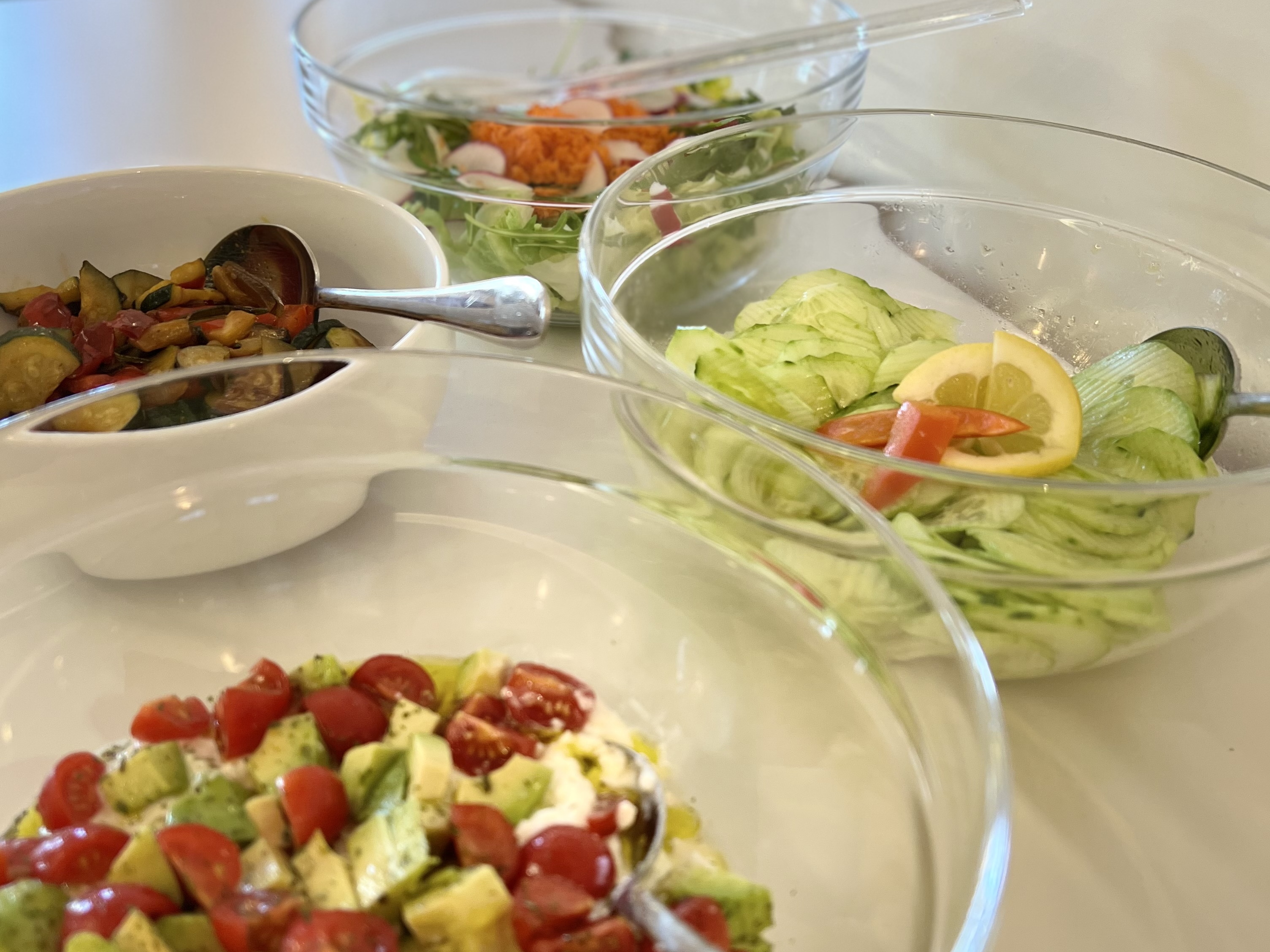 Täglich: Buffet mit verschiedenen Salaten wie grüner Salat, Mais-, Gurken-, Randen- oder Fenchelsalat, Tomaten-Mozzarella-Salat sowie saisonalem Gemüse.