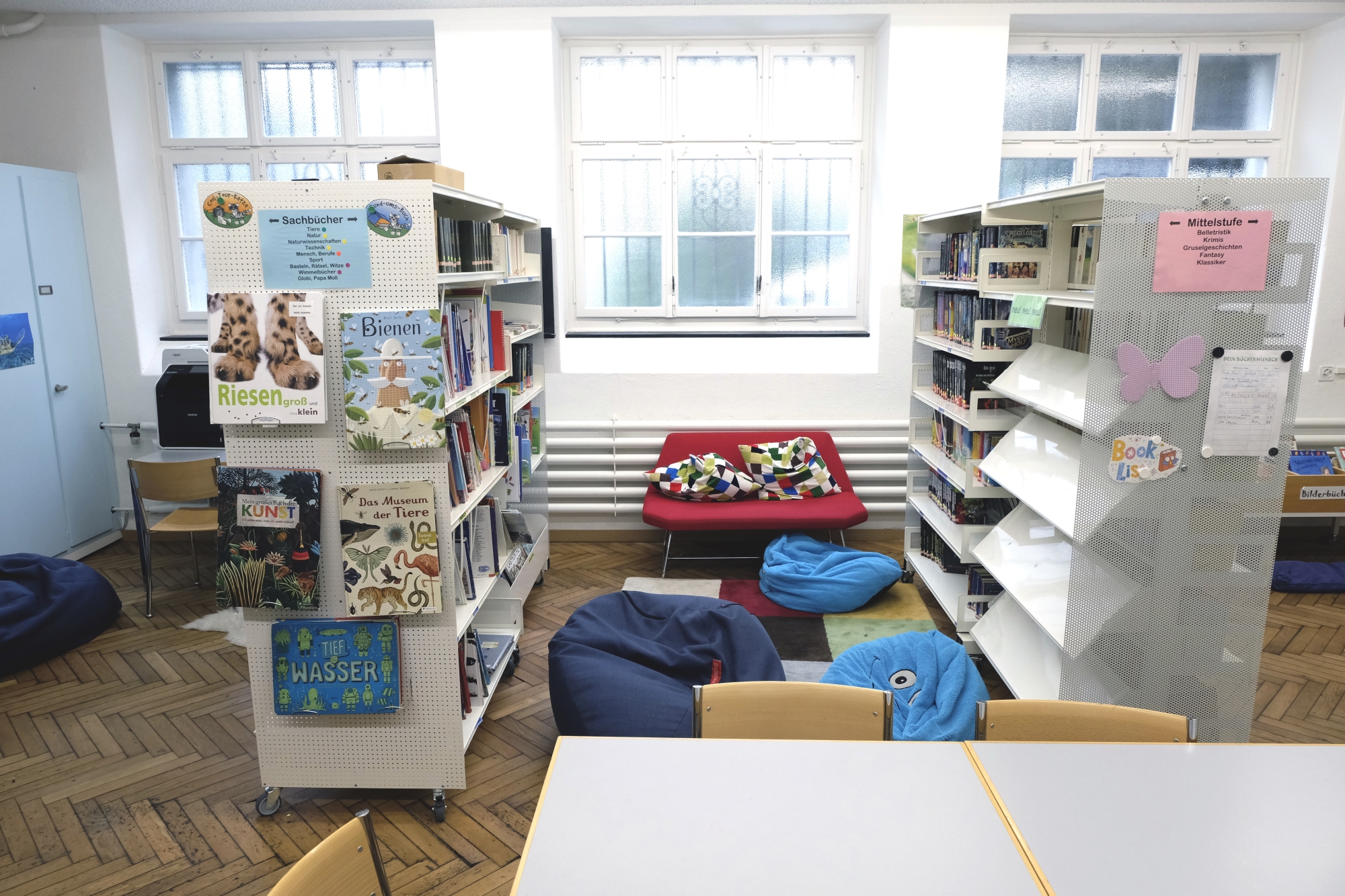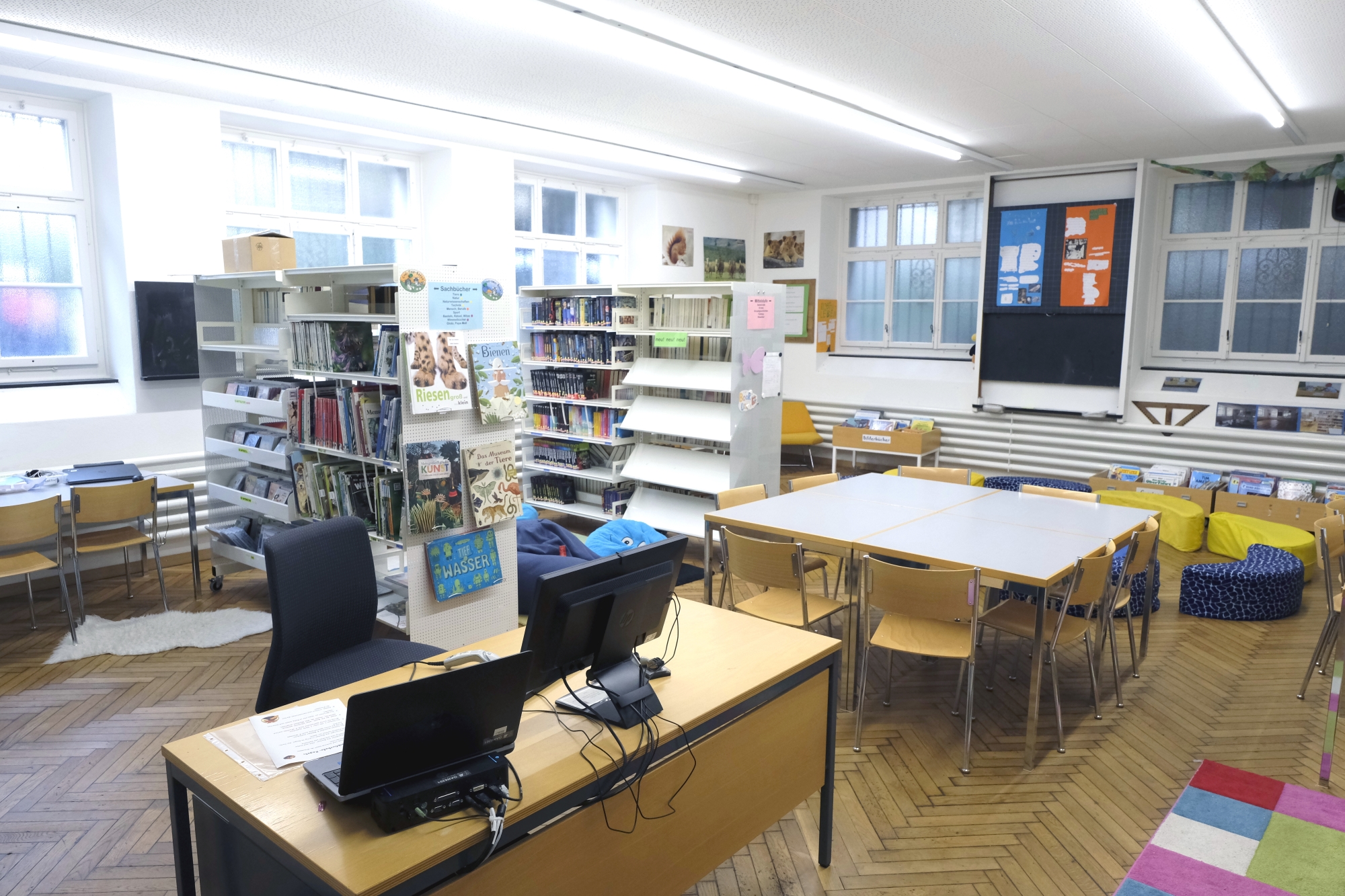Die Schulbibliothek umfasst circa 4500 Medien. Im Angebot stehen Bilderbücher, Bücher für Leseanfänger, Belletristikbücher für die Unter- und die Mittelstufe, Sachbücher, Hörbücher, DVD's und Comics. Auch steht ein kleines Angebot an Lern-und Gesellschaftsspielen und ein Computer mit Internetzugang zur Verfügung.
