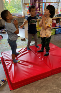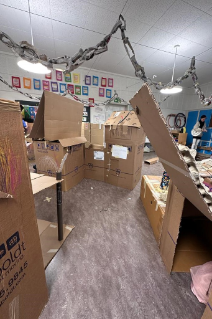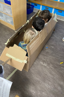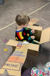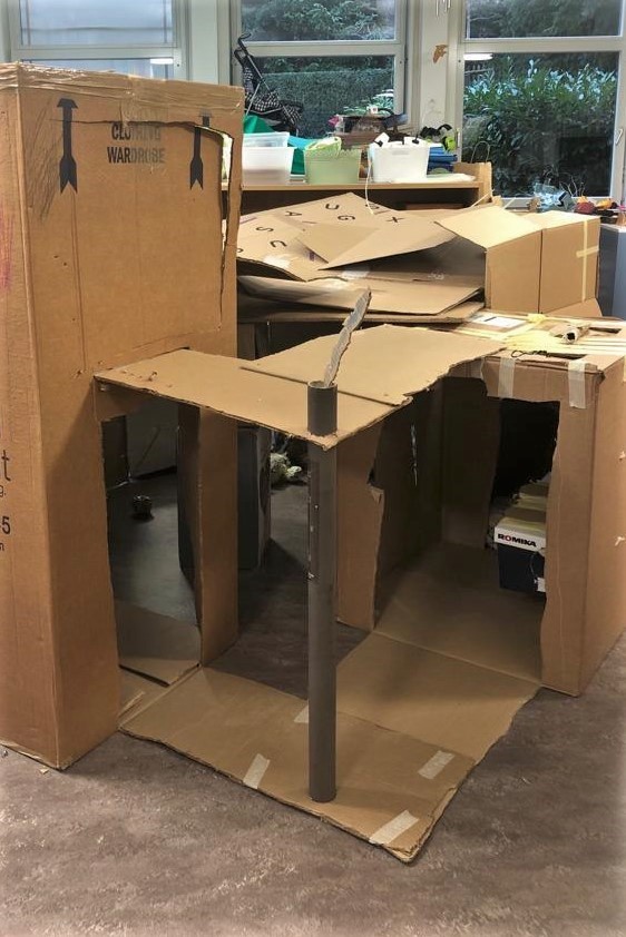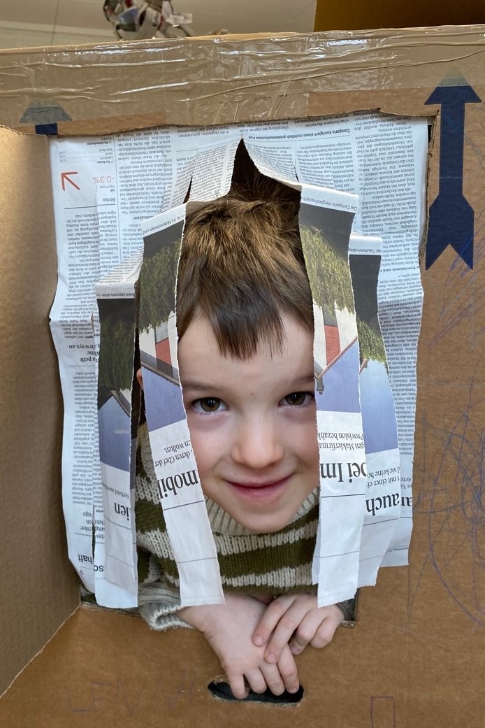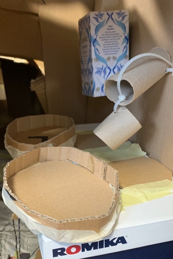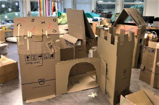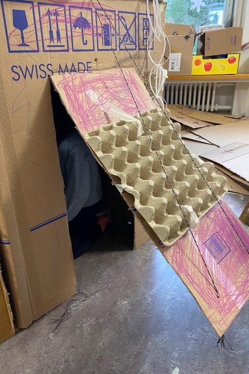 Bei diesem kommen zwei Studierende zu der Lehperson in den Kindergarten. Dieses mal drehte es sich um das Thema Karton. Zuerst wurden alle Tische und Spielsachen weg geräumt. Ganze 3 Wochen basteln, werkeln und bauen die Kinder nun mit Karton und bekommen Tricks und Materialien gezeigt um diese zu verbinden, aufzustellen oder coole Mechanismen zu integrieren. So wurden mit Klebebändern, Rundkopfklammern, Kabelbindern und Schnüren wahre Meisterwerke geschaffen.