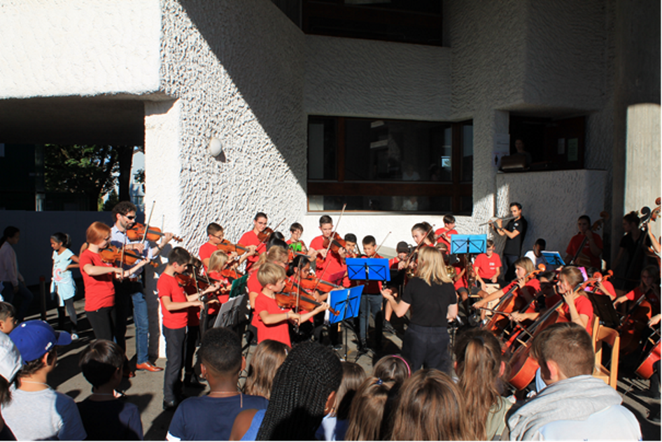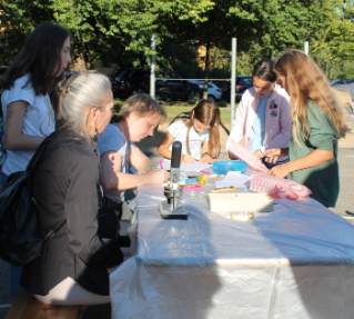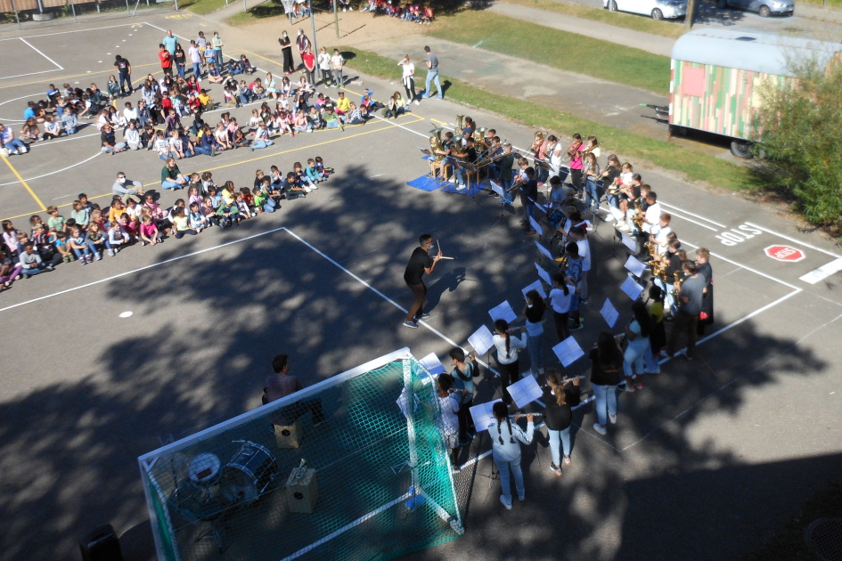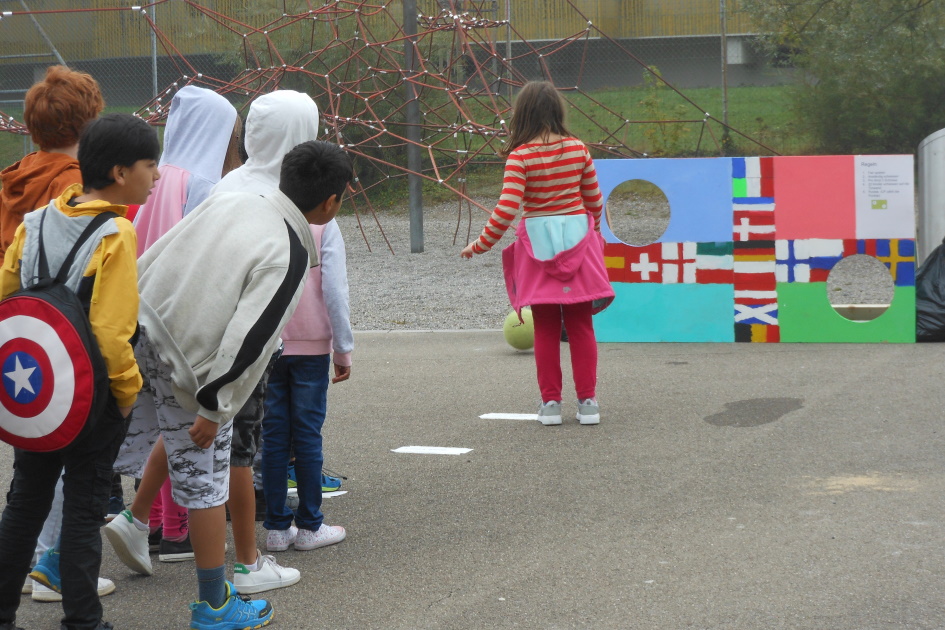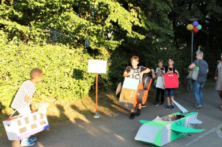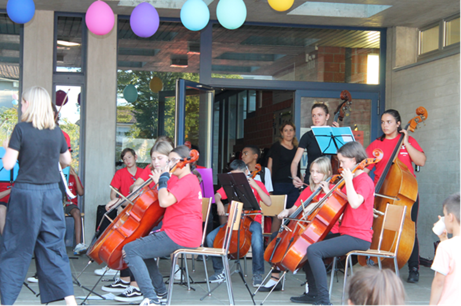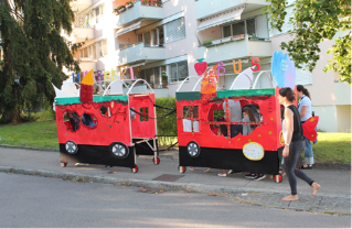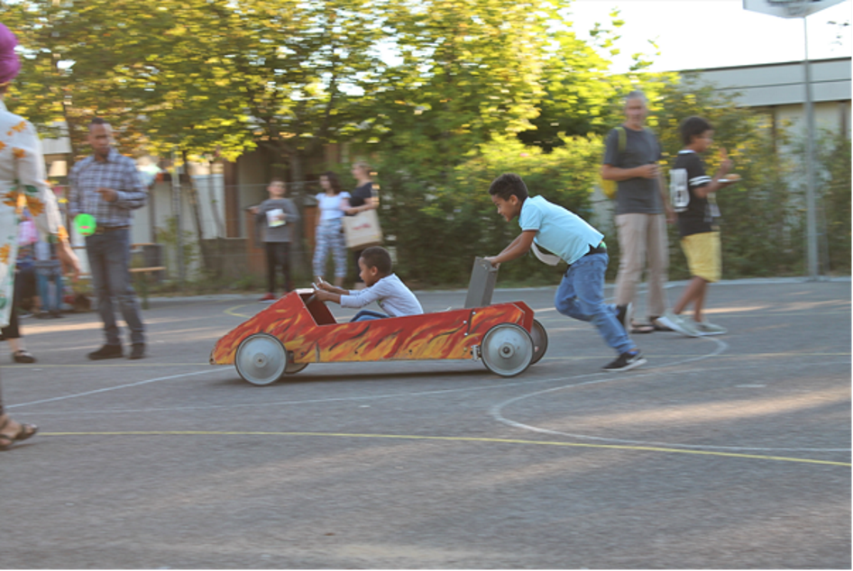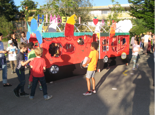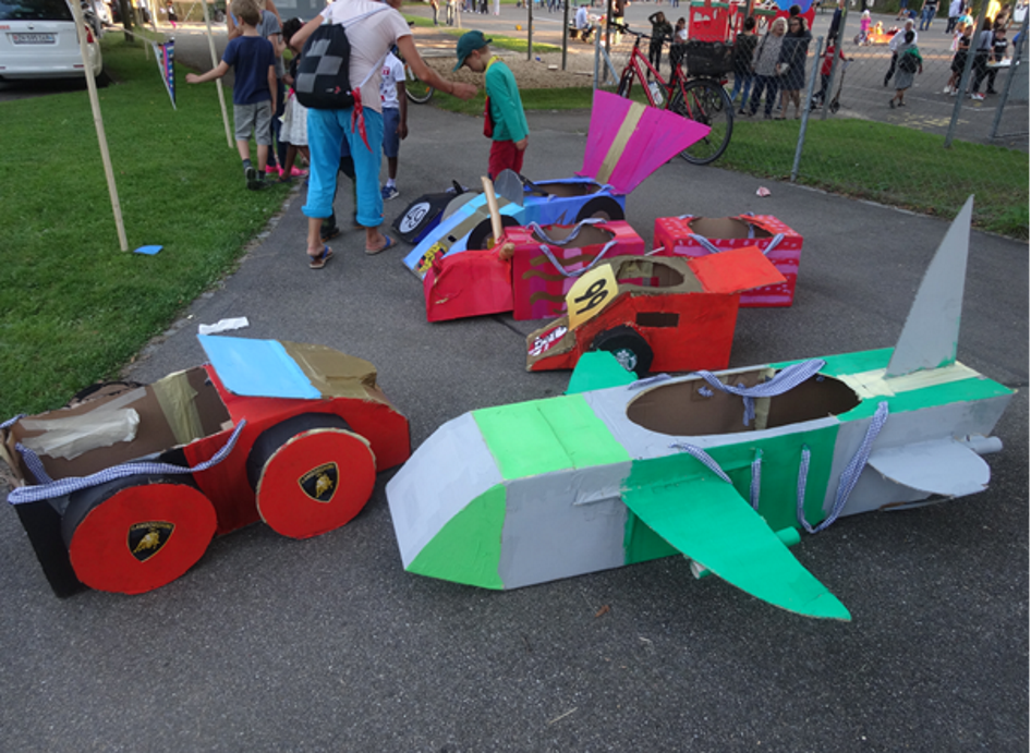 Es gab Essstände, wo man sich Popcorn oder Zuckerwatte holen konnte. Wir hatten Autos gebaut, mit denen man bis zum Staudenbühl «fahren» konnte. Auf der Bühne am Pausenplatz waren viele Kinder am Tanzen. Es gab Musik aus verschiedenen Ländern. Eine Frau hat toll getanzt. Eine DJ-Frau hat Musik gespielt.