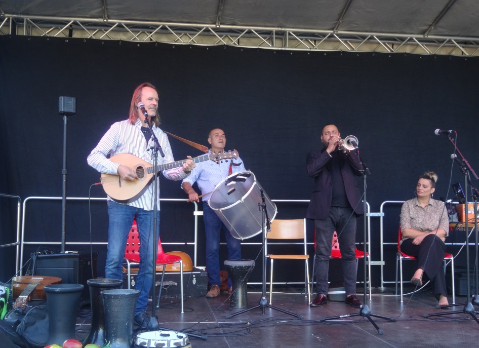 Auf der Bühne am Pausenplatz gaben ein Mann und eine Frau ein Konzert. Der Mann spielte Gitarre und die Frau sang in verschiedenen Sprachen.